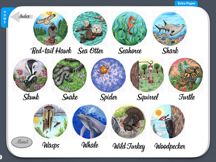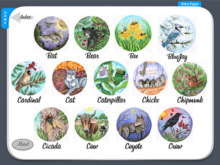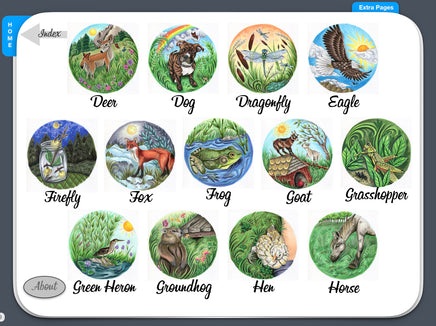 117 pages with a table of contents that features each of the sentient beings found in the deck. Selecting an image brings you directly to that creature’s page.