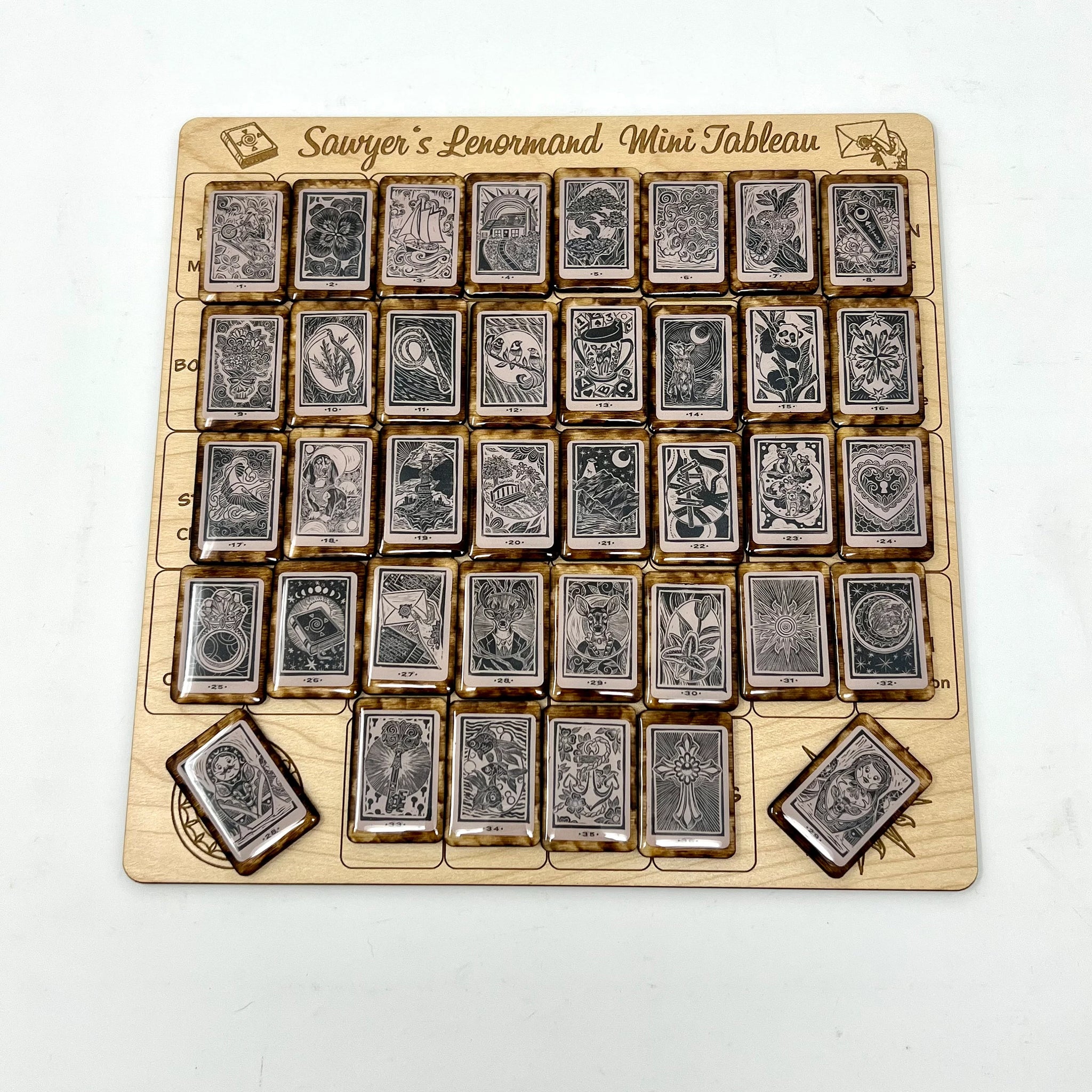 Hand crafted 38 piece Tiny Linocut Lenormand wooden tile set complete with a Smaller version of our Grand Tableau Casting Board, Made specifically to fit the Tiny Lenormand tiles.