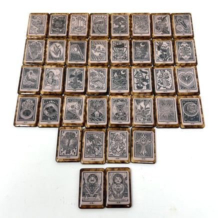 Each tile measures approximately 1”x 1.5”, (2.54cm x 3.81cm) the birch is burned for a worn effect*, the images are printed on high quality vinyl, then resin sealed for a completely durable and unique look. The backs feature the engraved version of the linocut lenormand backs.