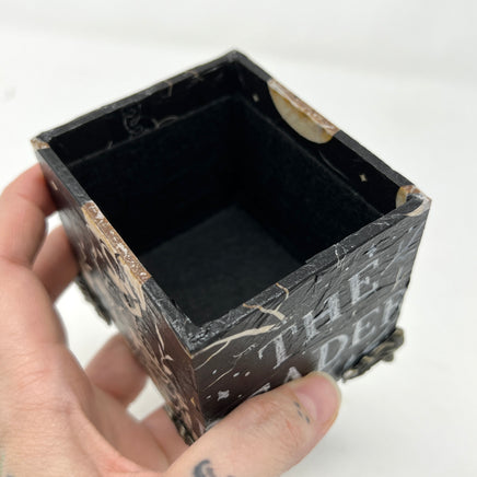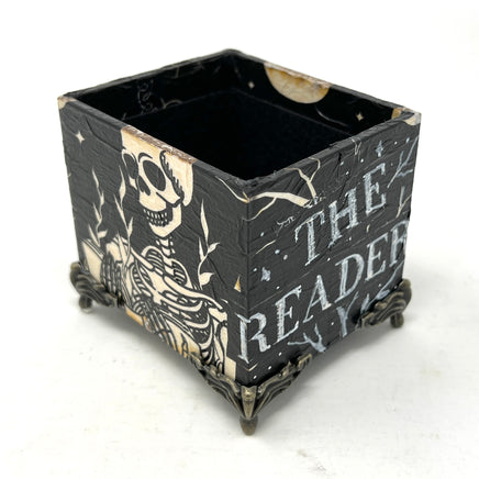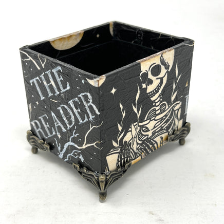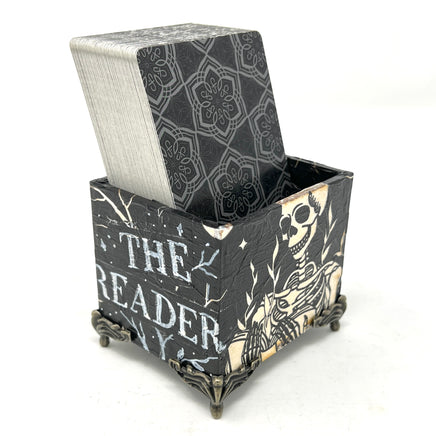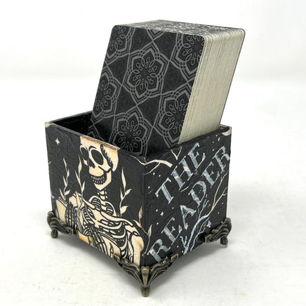 Keep your current deck at hand’s reach with this decorative box. Designed specifically to hold a standard sized Tarot deck (or two). This box was created using a decoupage technique, then sealing with a clear coat for durability. Adorned with a skeleton reading a book and “The Reader” on the sides.