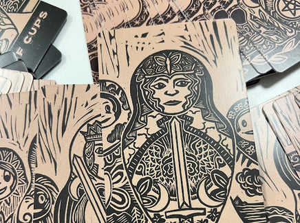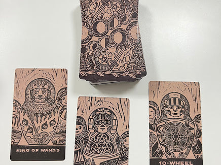 Back in October 2021, I rekindled my love for the art of Linoleum block printing. Having carved my way through Sawyer’s Lenormand (See our Linocut Lenormand deck) I didn’t want to stop playing with this meditative process. The alternate signifiers in the Linocut Lenormand were based of of the nesting doll shape, and just so much fun to create. I started thinking about how I might draw the Fool in that form— how to keep the popular symbols of the RWS universe intact.