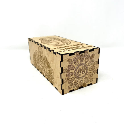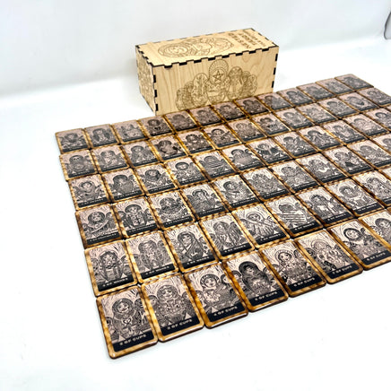 78 laser engraved and cut tiles featuring a scaled down version of the actual card backs. The tiles come in shipped in a puzzle style box featuring artwork from my original line drawings.