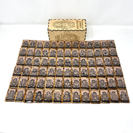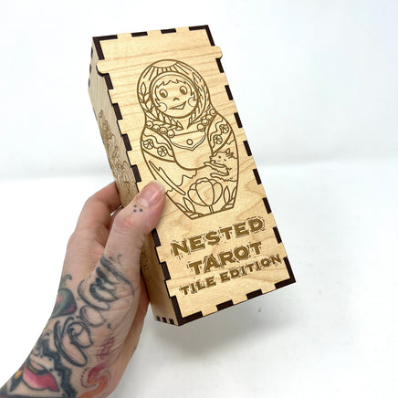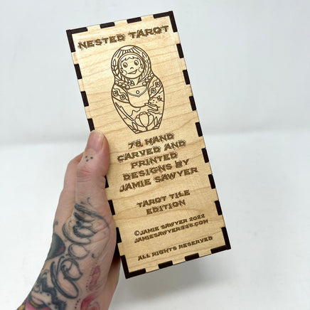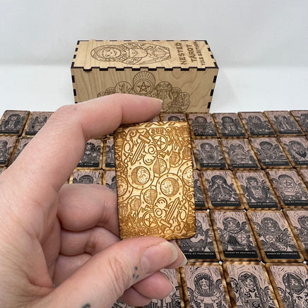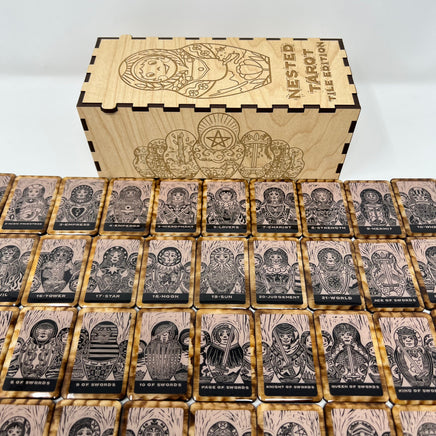 Nested Tarot Tiles hand crafted 78 piece mini version of the hand-carved and stamped deck based off of the Nesting Doll shape.