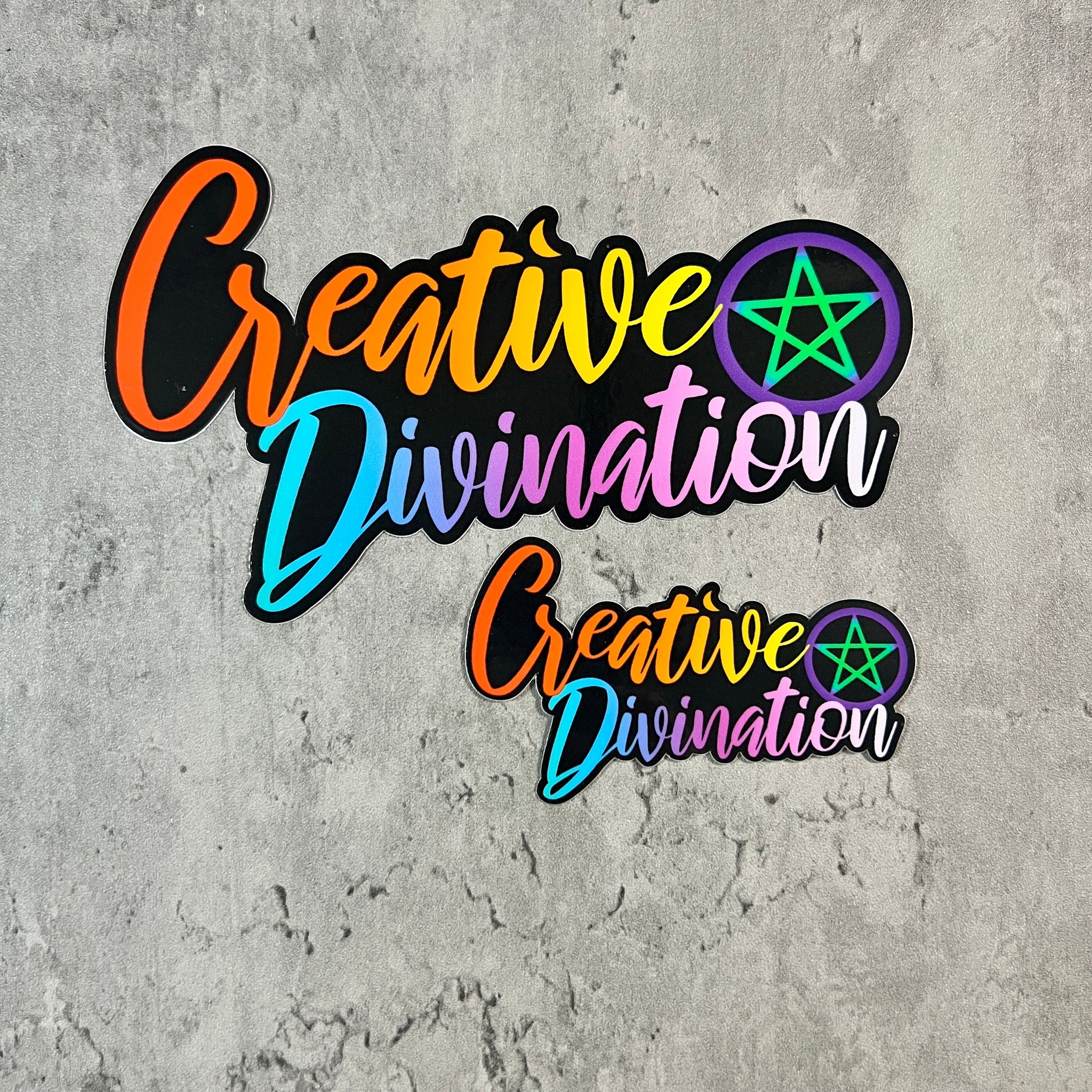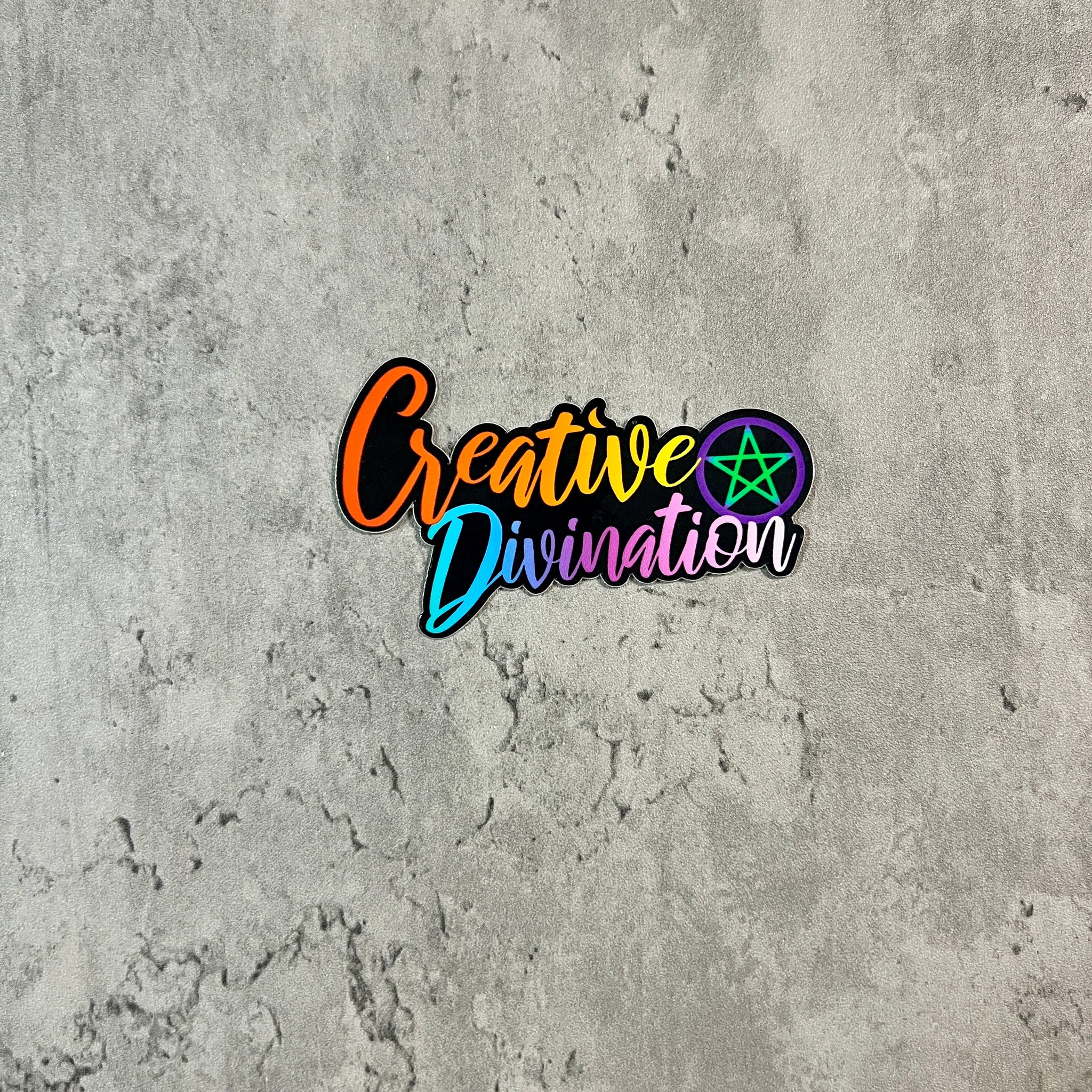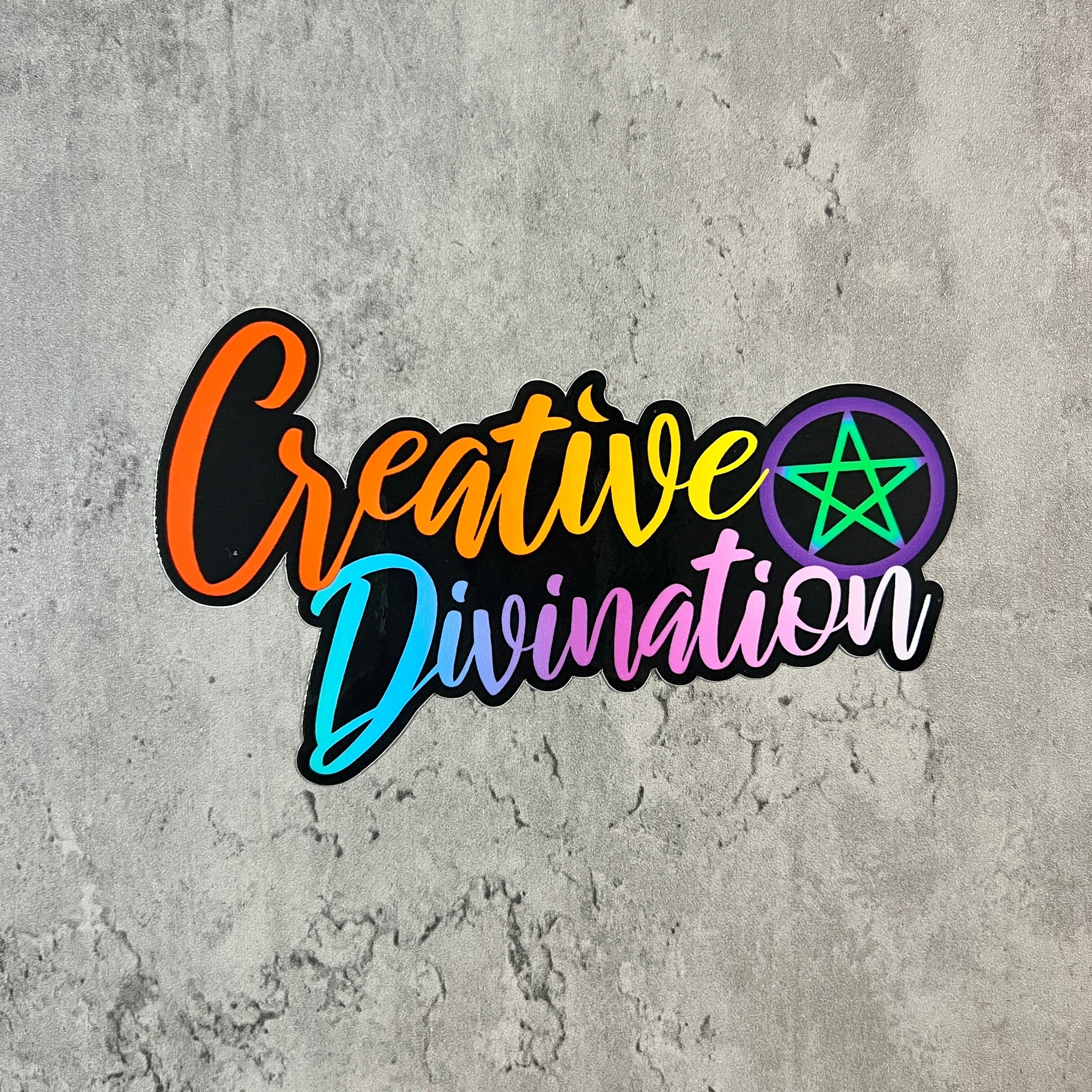Your choice of one of our rainbow series stickers.  This one features “Creative Divination” with a pentacle to space the words.