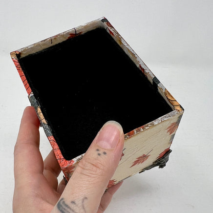 This box was created using a decoupage technique, then sealing with a clear coat for durability. Adorned with a couple black kitties hiding in a patch of pumpkins.