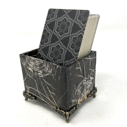 Keep your current deck at hand’s reach with this decorative box. Designed specifically to hold a standard sized Tarot deck (or two). This box was created using a decoupage technique, then sealing with a clear coat for durability. Adorned with spiderwebs, the perfect decor for the stories we weave while interpreting the cards!