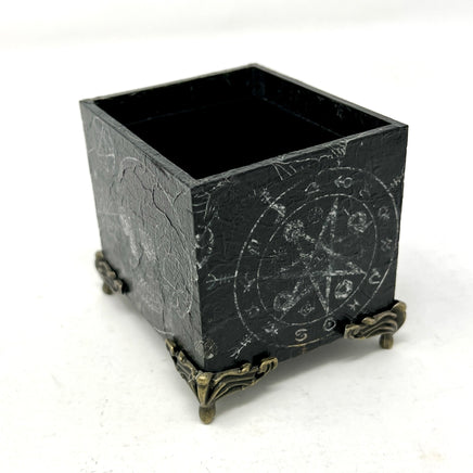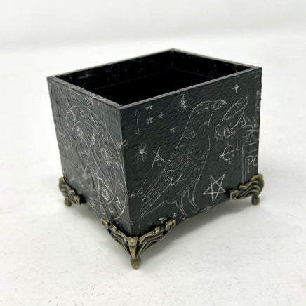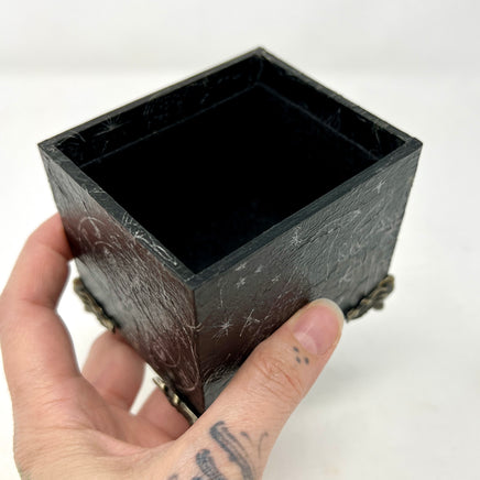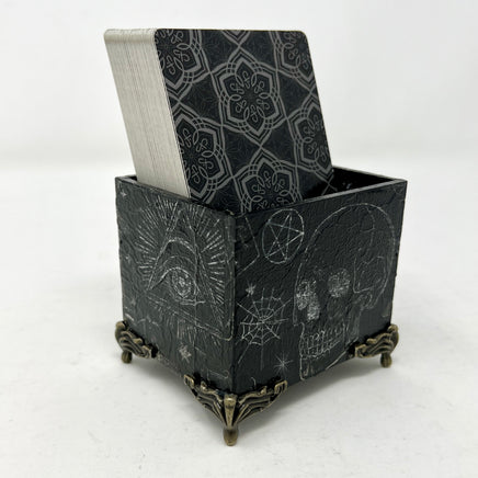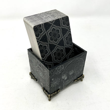 Keep your current deck at hand’s reach with this decorative box. Designed specifically to hold a standard sized Tarot deck (or two). This box was created using a decoupage technique, then sealing with a clear coat for durability. This particular box has subtle design elements since I painted it black before adding the print… then I went back over and brightened them up. For when you want to make a witchy statement without it being too in your face!
