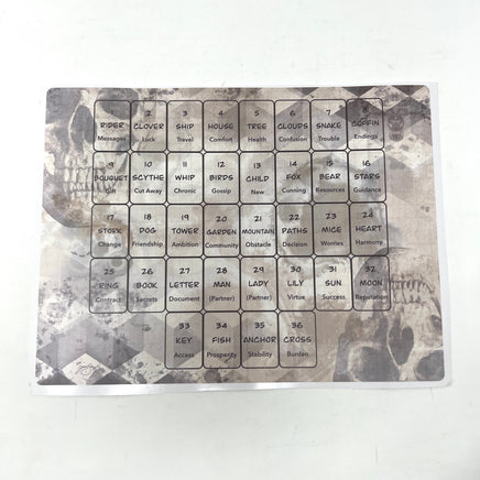The sticker is set horizontally with a vintage skull backdrop and geometric patterning backdrop. (Lenormand Tiles sold separately)