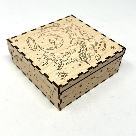 Store your favorite charms or Tiny Tarot Tiles close by with this new style trinket box! The top features a crescent moon with magical charms floating in the clouds around it. There’s an open eye above and a closed below nodding to the inner and outer energies that are connected when we use a deck of cards! The sides boast constellations of the zodiac.