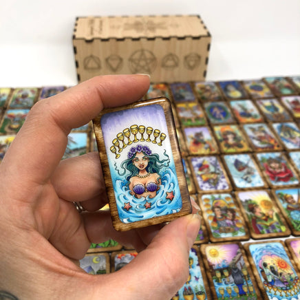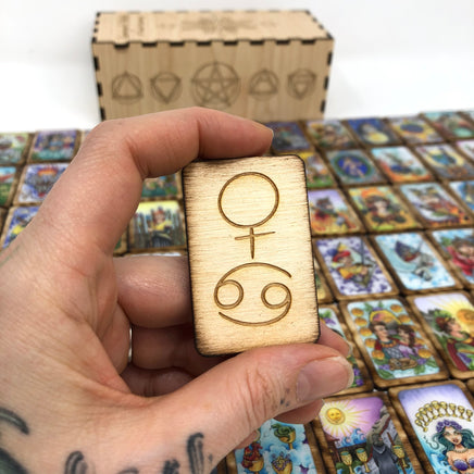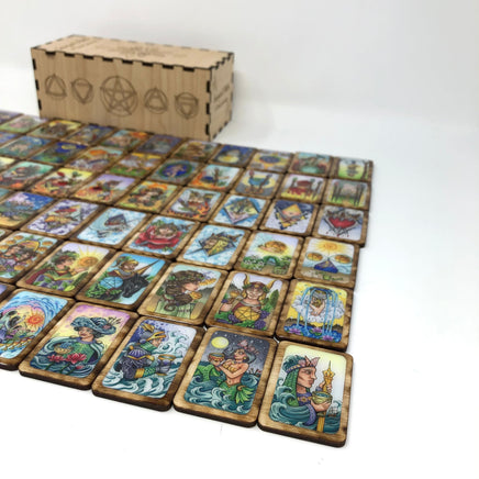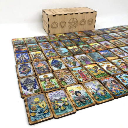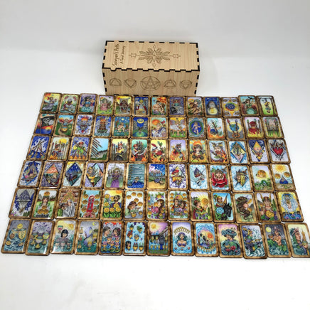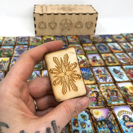 Sawyer’s Path Tarot as miniature heirloom Tarot Tiles. Hand crafted 78 piece mini Sawyer’s Path Tarot wooden tile set complete with a wooden engraved box.