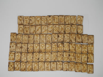 Each tile measures approximately 1.25”x 2”, (3.18cm x 5.10cm) the tiles are cut from Baltic birch and burnt for a unique weathered effect. The images are printed on high quality vinyl then resin sealed for a completely durable and unique look.