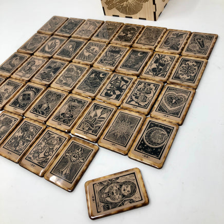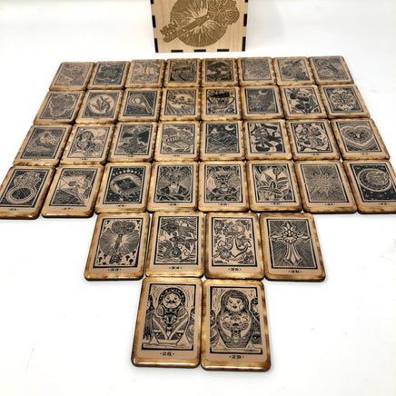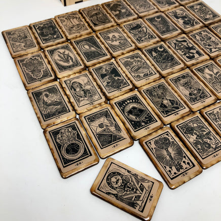 Un mini juego de fichas de madera Sawyer's Lenormand de 36 piezas, hecho a mano, con caja de madera grabada. Hecho a la medida, permita 1-2 semanas para la creación antes de que usted reciba una notificación de envío.