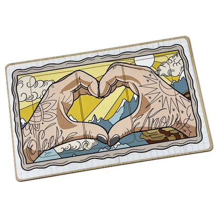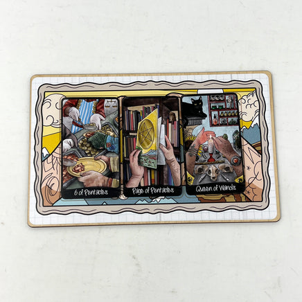 Un mini tableau de tirage en couleur présentant les mains de cœur « Seek » et « Know » de notre dernière édition du Tarot Out of Hand. Les espaces conviennent à la variété de poche ou à tout autre petit jeu… Veuillez donc noter que cela ne conviendra pas à 3 cartes de taille standard…