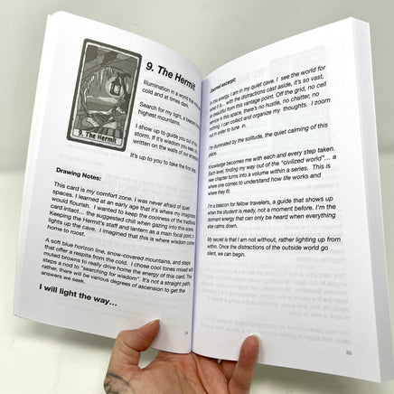 Nous avons opté pour un livre plus grand avec ce jeu, partageant quelques significations suggérées ainsi que des notes de dessin et une réflexion personnelle/entrée de journal.