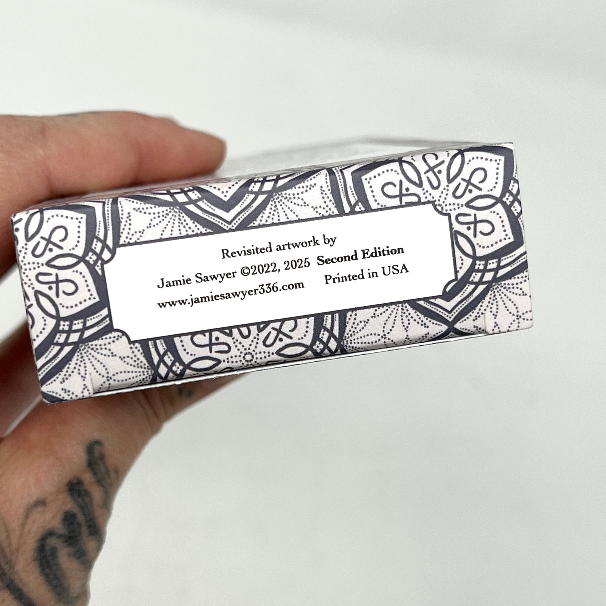 The major noticeable changes can be seen via the tuck box, we’ve gone with a lighter theme to match The Hermit, since we collectively are in a Hermit year (2025).  The card backs also reflect the lighter, gray-blue tones with a little larger sized print of the mandala design.