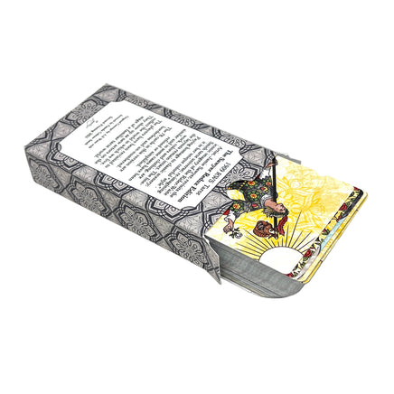 The cards in this version are borderless and un-numbered. Instead you will find faint mandalas in the background that have the numbers, astrological or elemental correspondences. The people have also been slightly revisited to reflect the world in which we live. They show up as new actors in this familiar world.