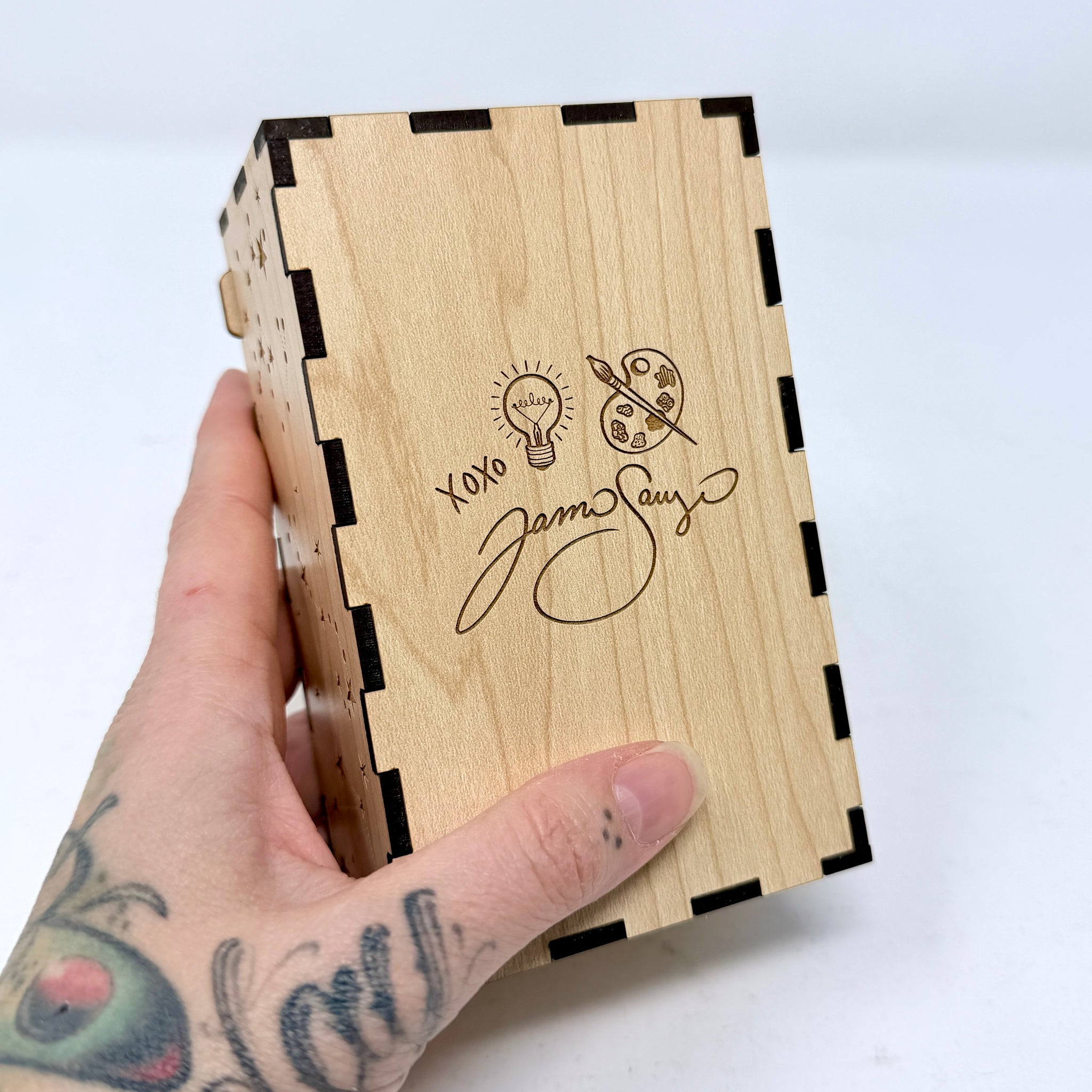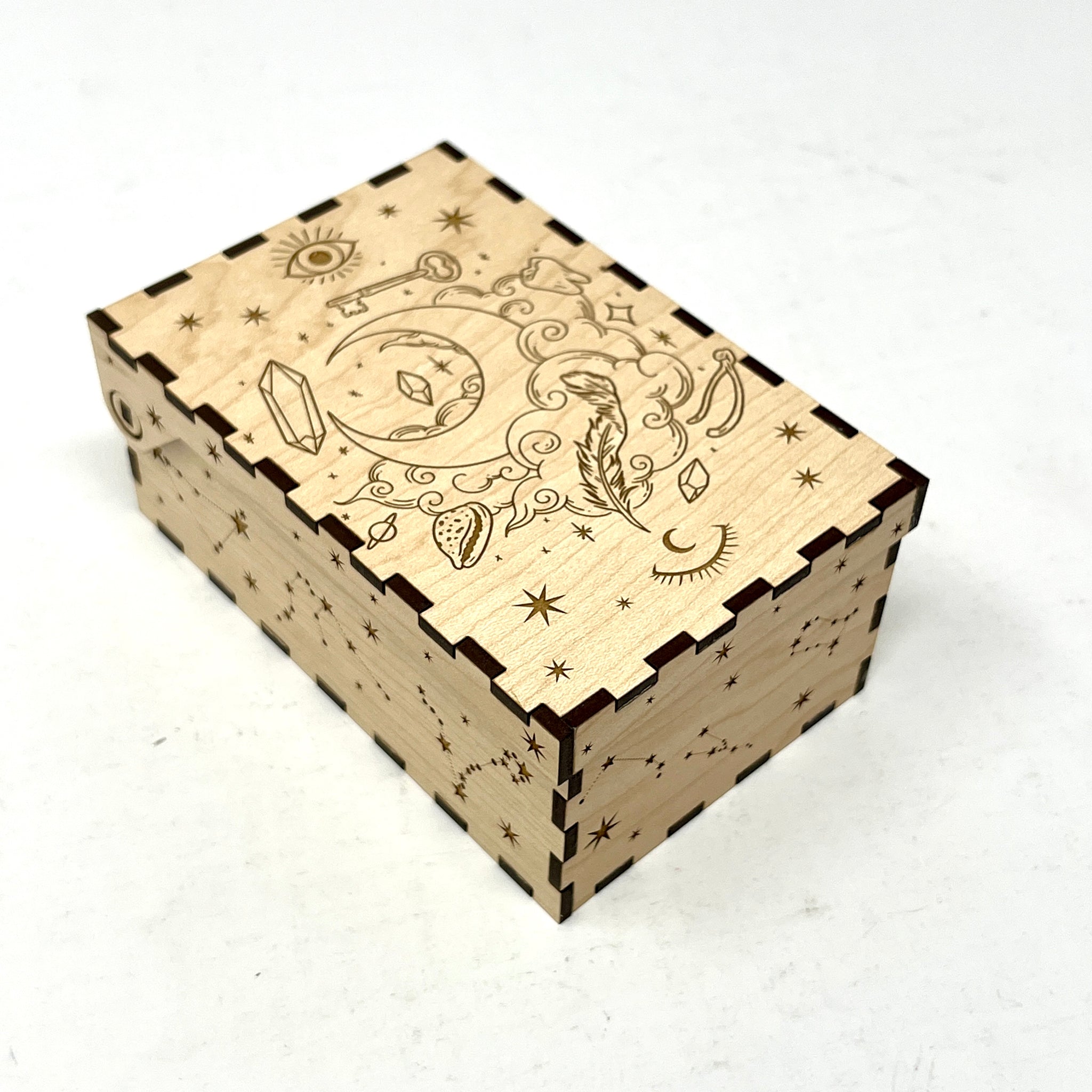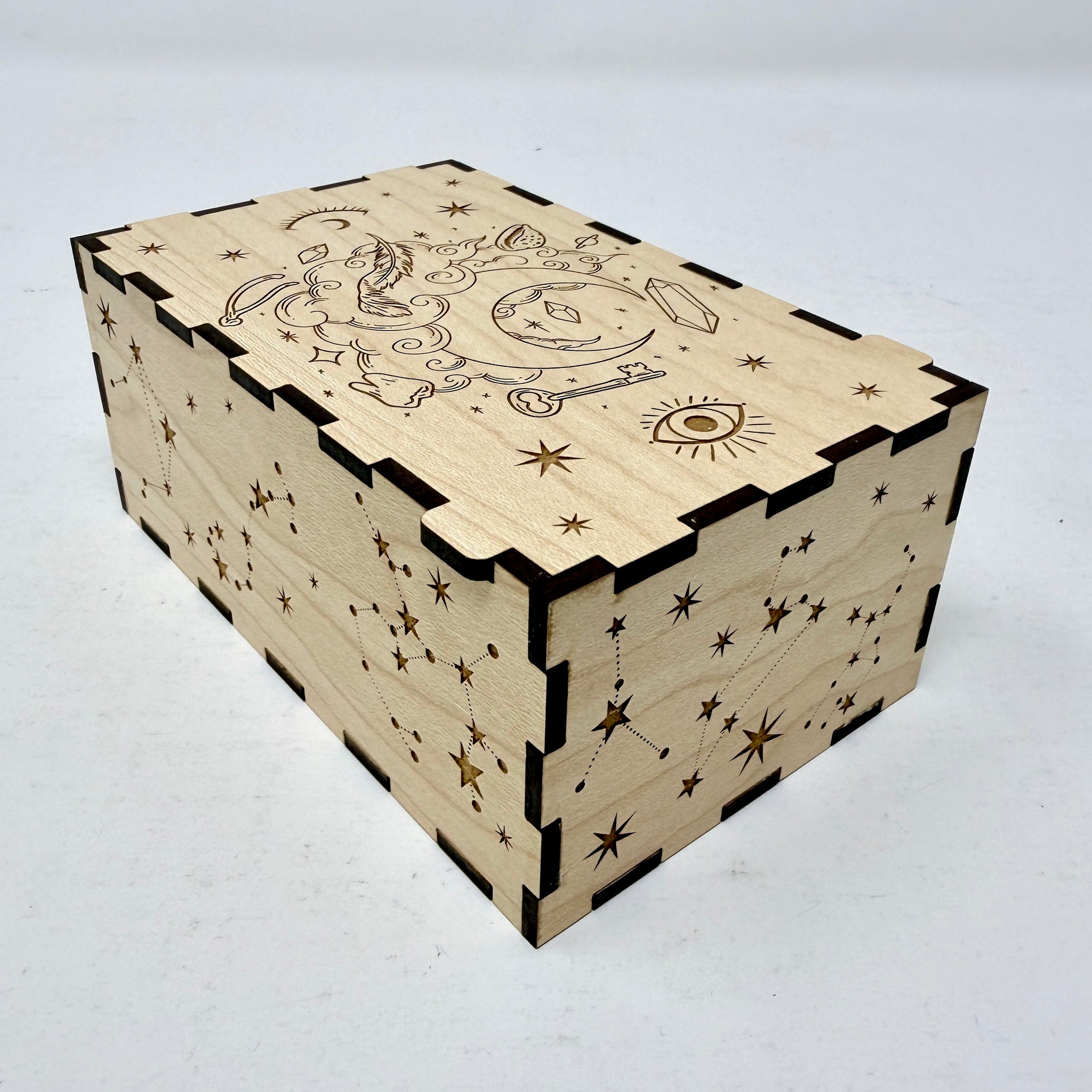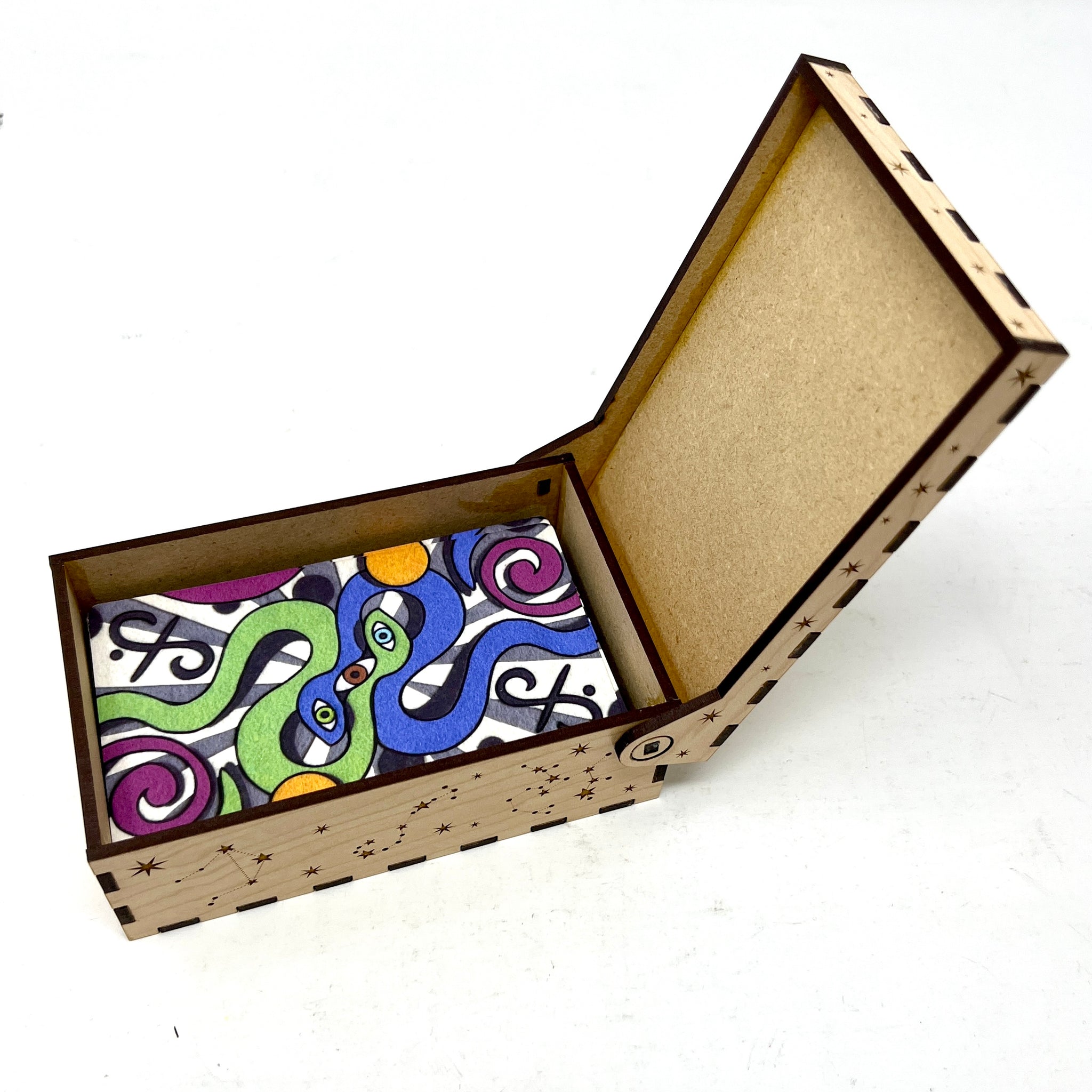 Store your current favorite working deck close at hand in this decorative engraved box. Featuring a crescent moon with magical charms floating in the clouds around it. There’s an open eye above and a closed below nodding to the inner and outer energies that are connected when we use a deck of cards! The sides boast constellations of the zodiac.