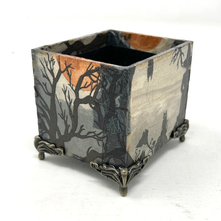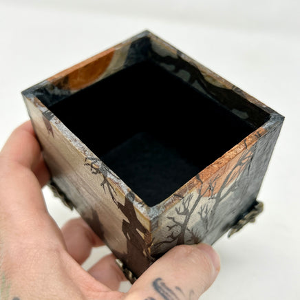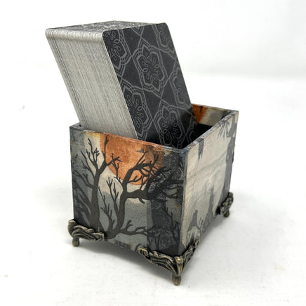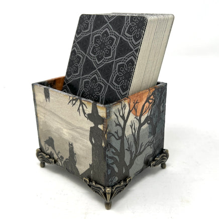 Gardez votre jeu actuel à portée de main grâce à cette boîte décorative. Conçue spécialement pour accueillir un jeu de tarot de taille standard (ou deux), elle a été réalisée selon la technique du découpage, puis scellée avec une couche transparente pour plus de durabilité. Elle est décorée d'une sorcière et de ses familiers au clair de lune.