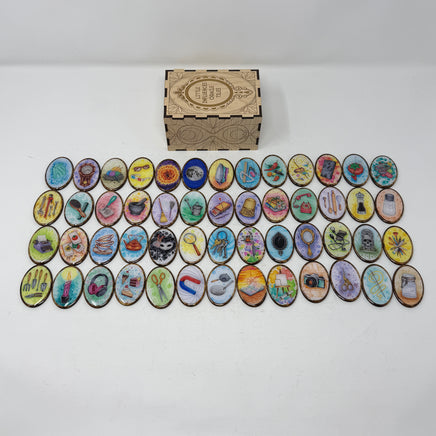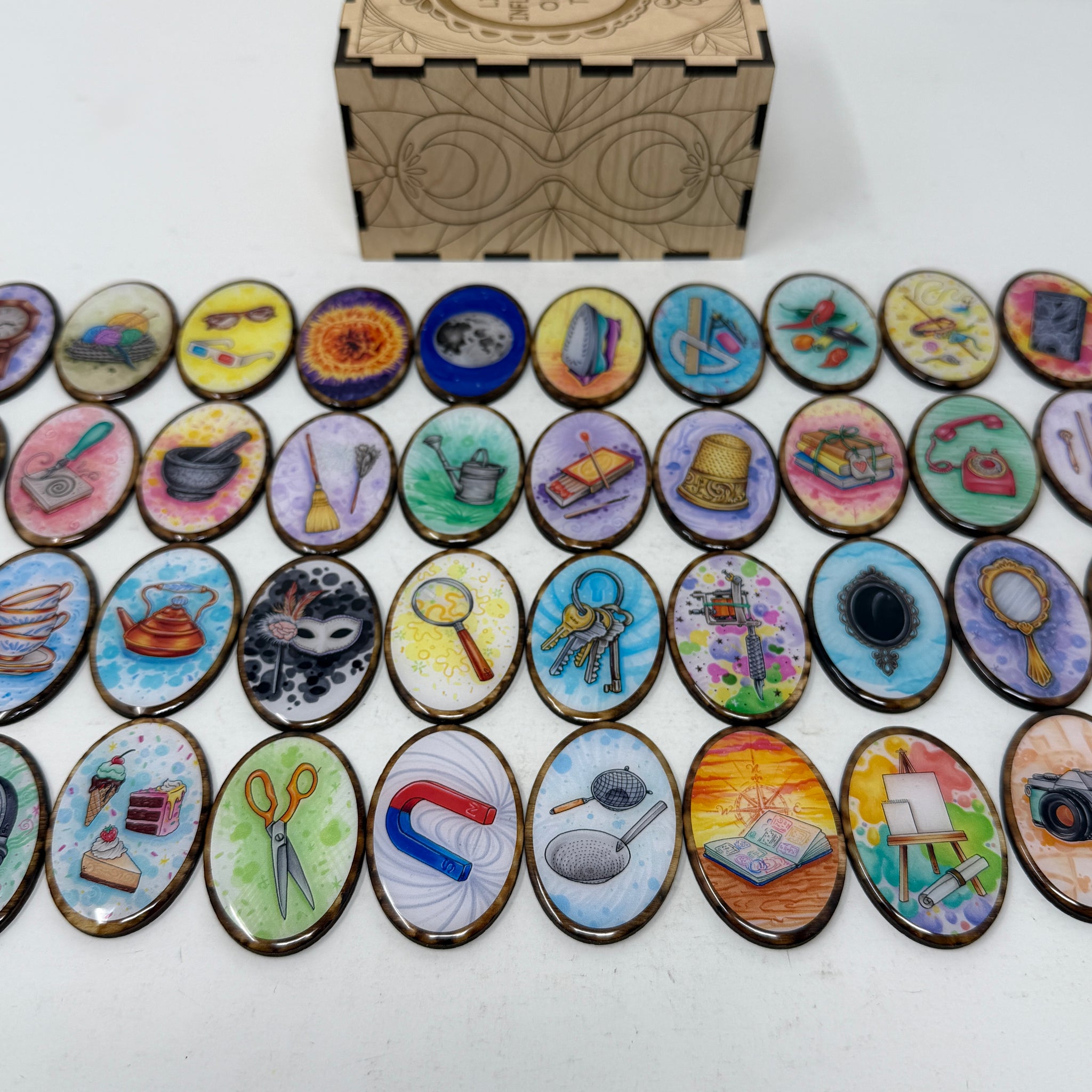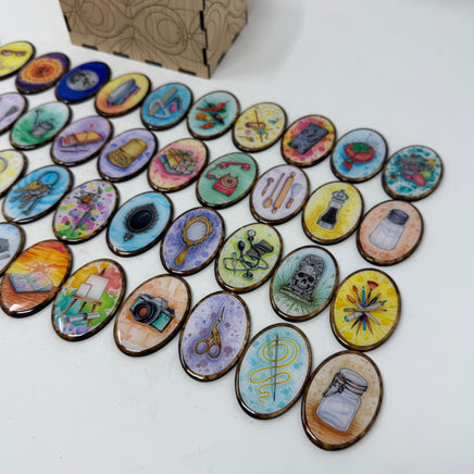 Chaque carreau ovale de 5 x 4 cm est fabriqué en bouleau brûlé pour un effet vieilli*. Les images sont imprimées sur du vinyle de haute qualité, puis scellées à la résine pour une durabilité et un aspect unique. Le verso présente un sablier stylisé, également présent au verso des cartes.