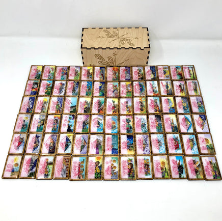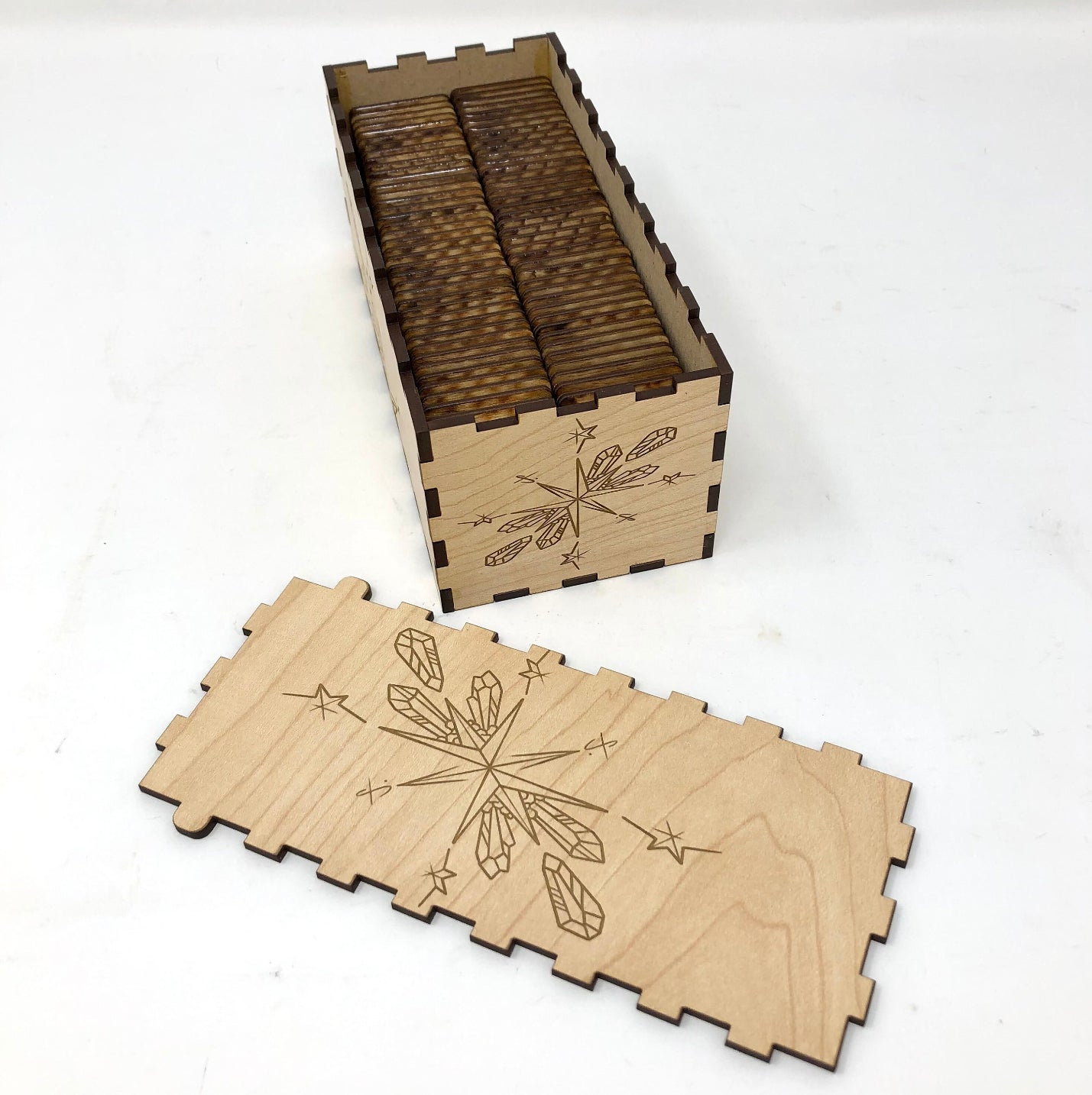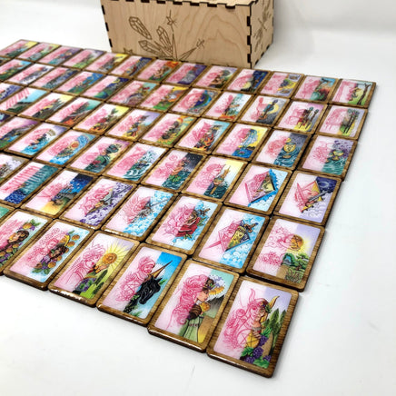 Une version miniature artisanale de 78 pièces du jeu de tuiles en bois SPT 33.6 (jeu mixte) avec une boîte en bois gravée.
