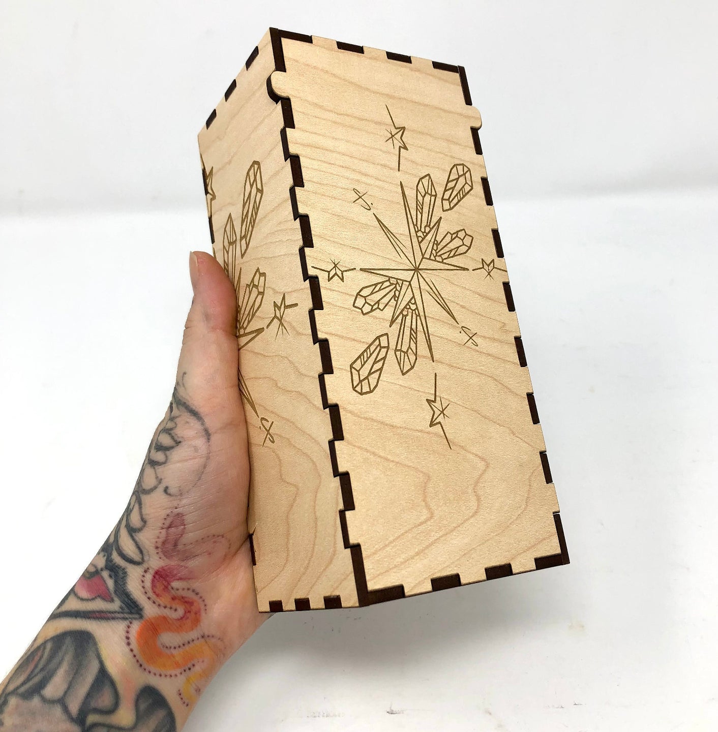 Le bois est brûlé pour un effet vieilli*, les images sont imprimées sur du papier photo de haute qualité puis scellées à la résine pour une durabilité et un aspect unique. Le verso présente une version stylisée et brute de l'étoile nautique Sawyer's Path ornée de cristaux (les bords brûlés peuvent varier selon les motifs du bois ; le motif sera identique au verso, mais l'aspect carbonisé peut différer légèrement).