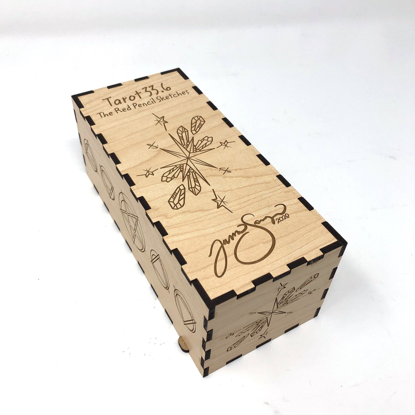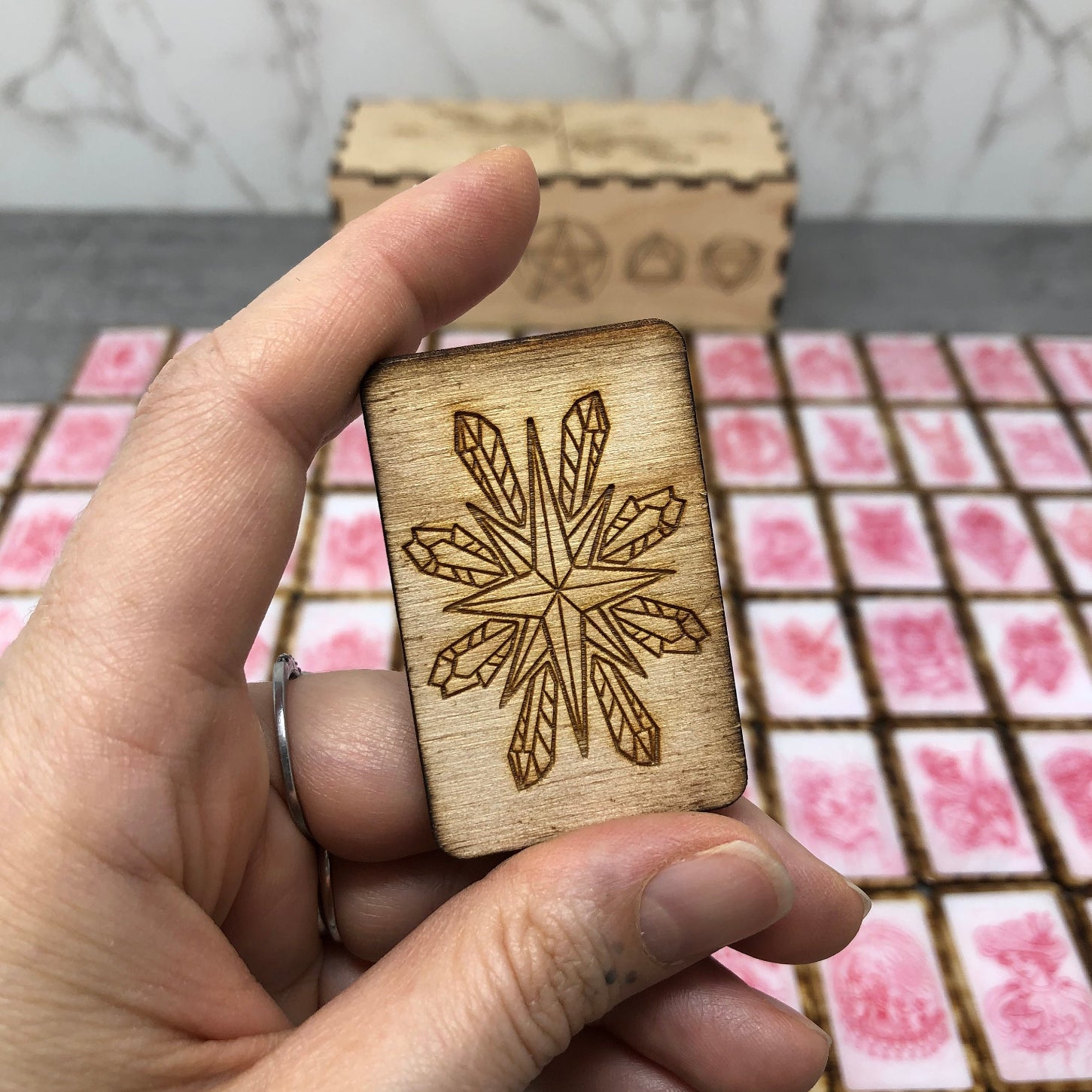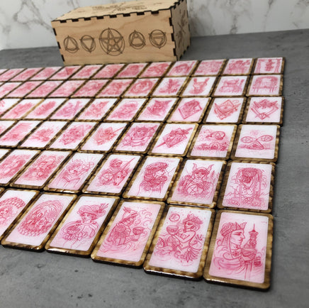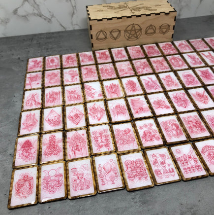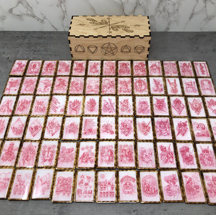 Notre version artisanale de 78 pièces de tuiles en bois Red Pencil Sketches, Tarot 33.6 (le précurseur du Chemin de Sawyer) est livrée dans une boîte en bois gravée.