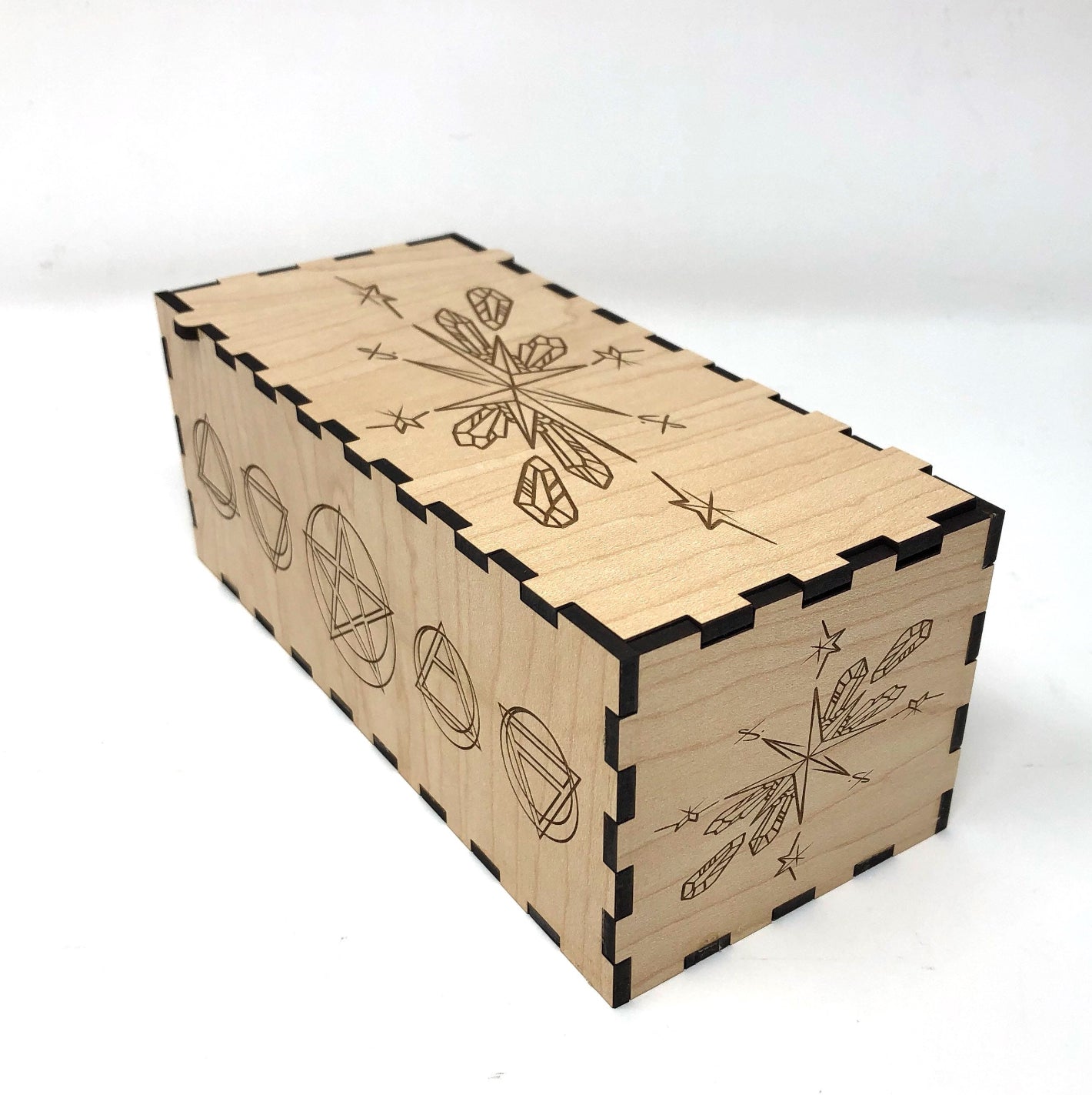 •Boîte de style puzzle gravée au laser représentant un mandala d'étoiles et de cristaux avec des symboles élémentaires et un pentacle sur les côtés.