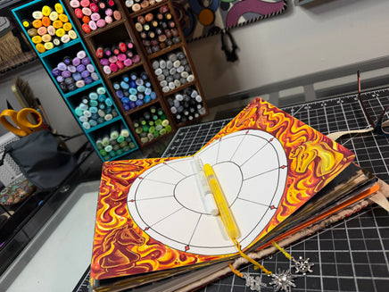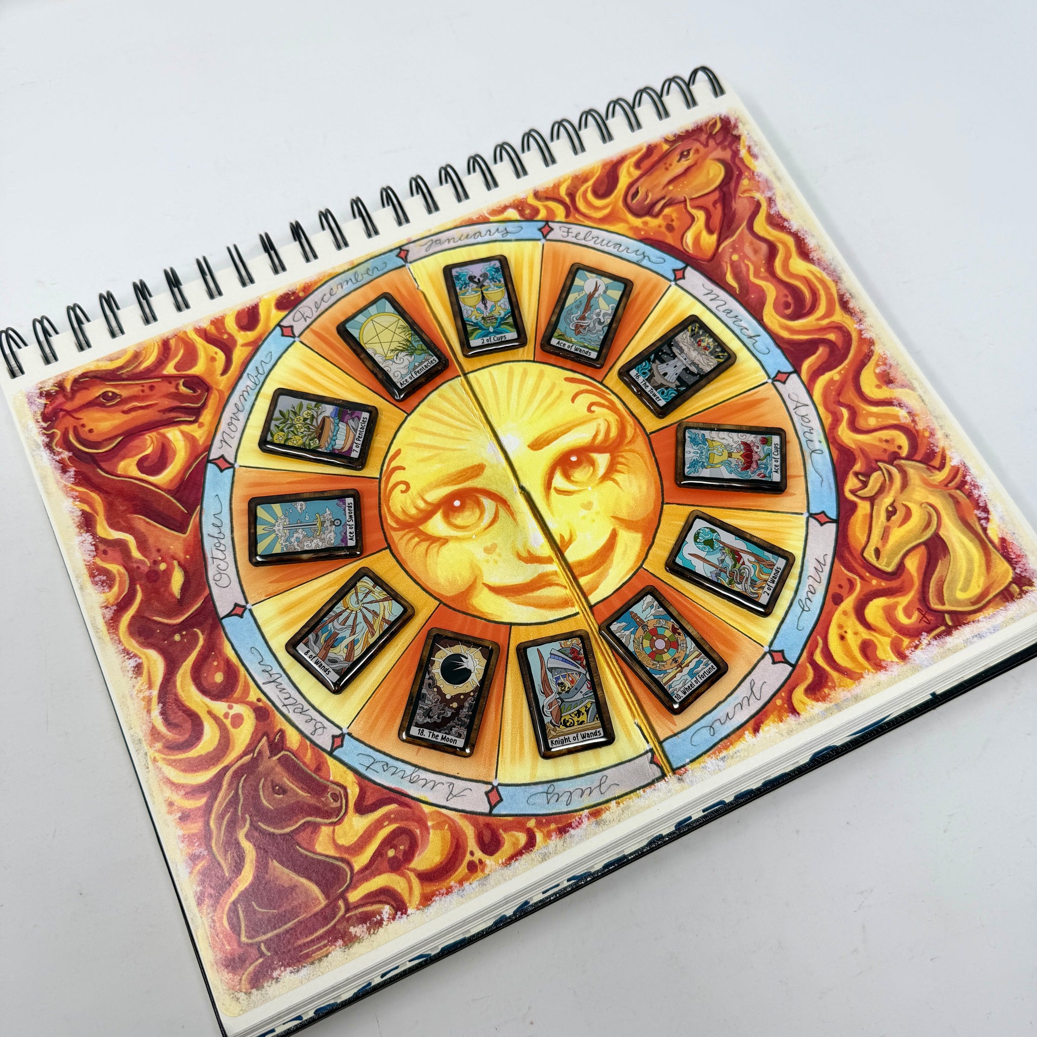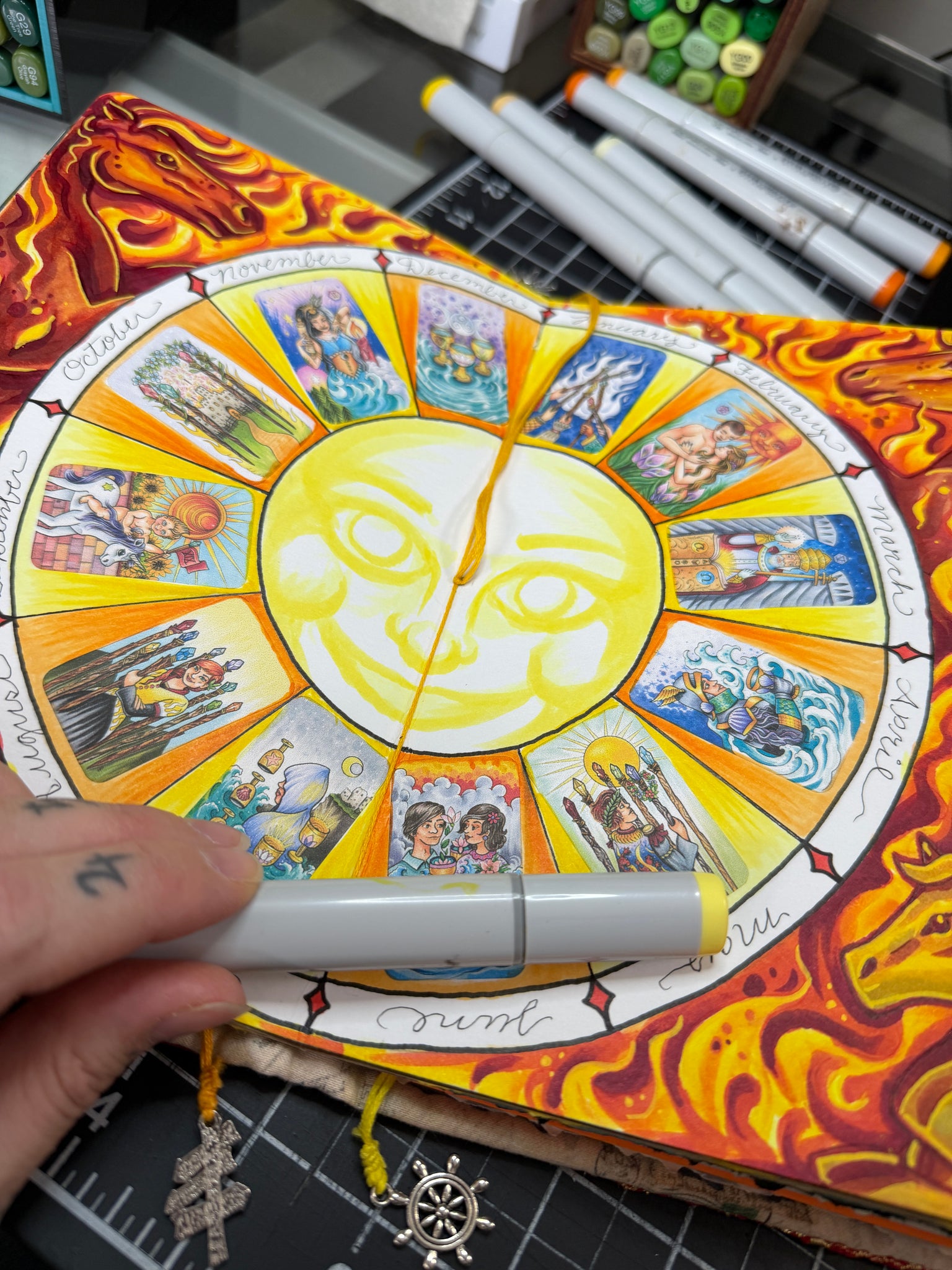 Year ahead spread based on my own personal 2 page journal spread.  The original was created using copic markers on Bristol paper.  When I shared the final result with my patreon community, there was interest in a version for a casting sticker.  I was able to scan in my pages (which is why the middle thread is visible) and re-color where my card images for 2026 were placed.
