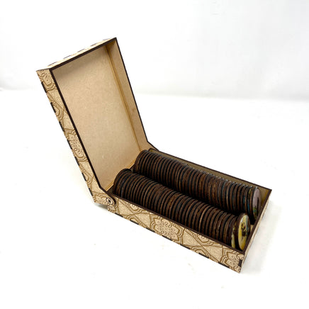 Each tile measures approximately 1.75” (4.45cm). The tiles are cut from Baltic birch  and burnt for a unique weathered effect. The images are printed on high quality vinyl then resin sealed for a completely durable and unique look.