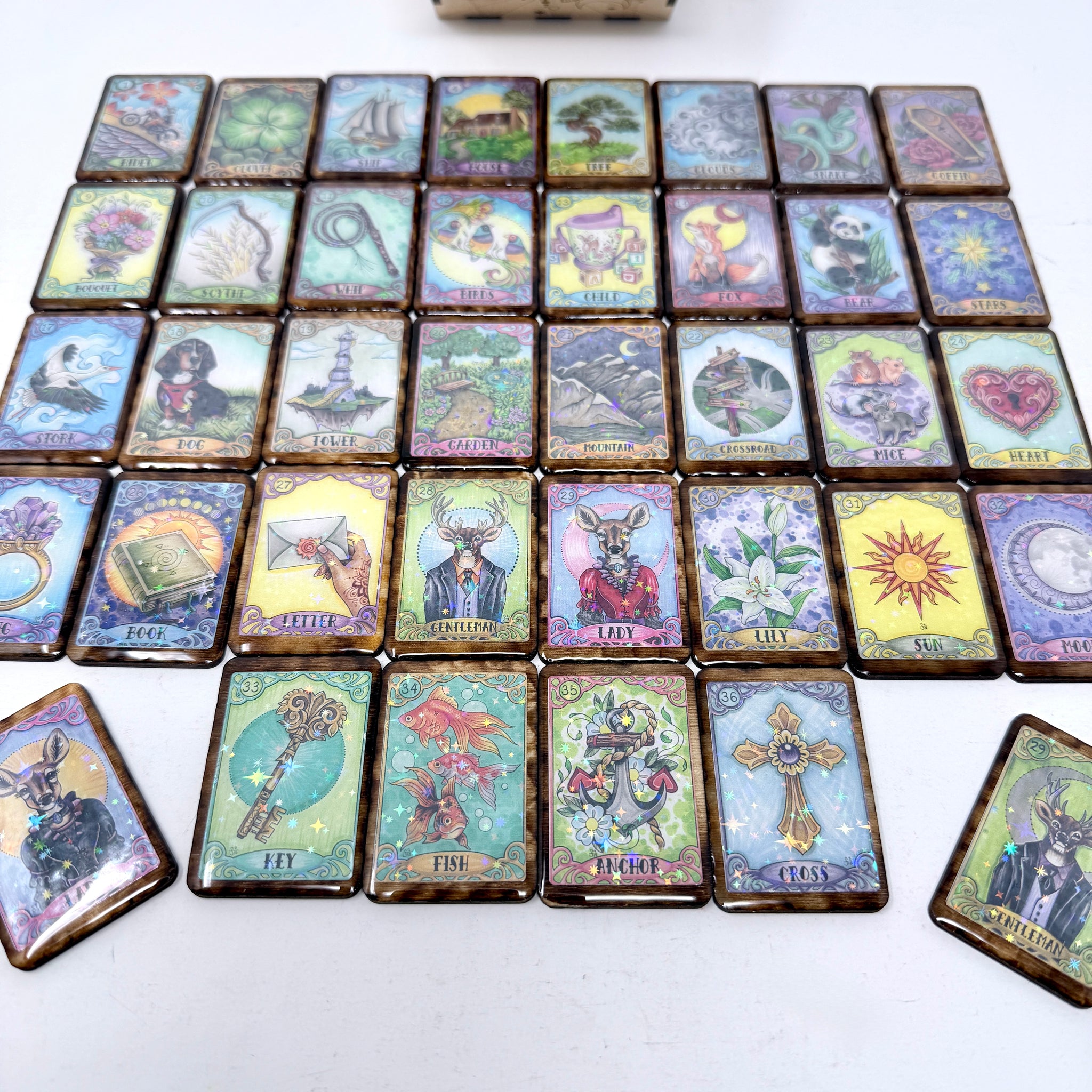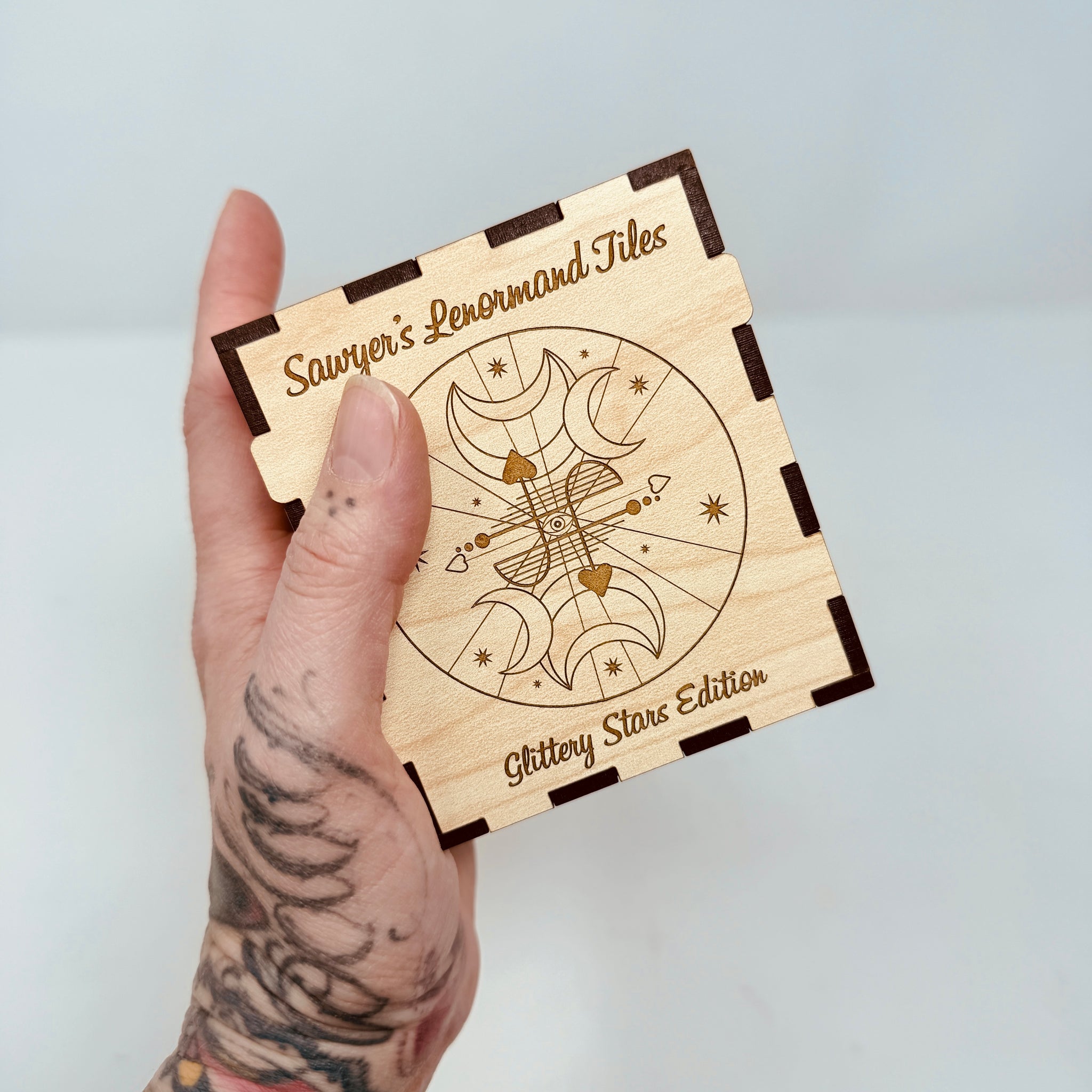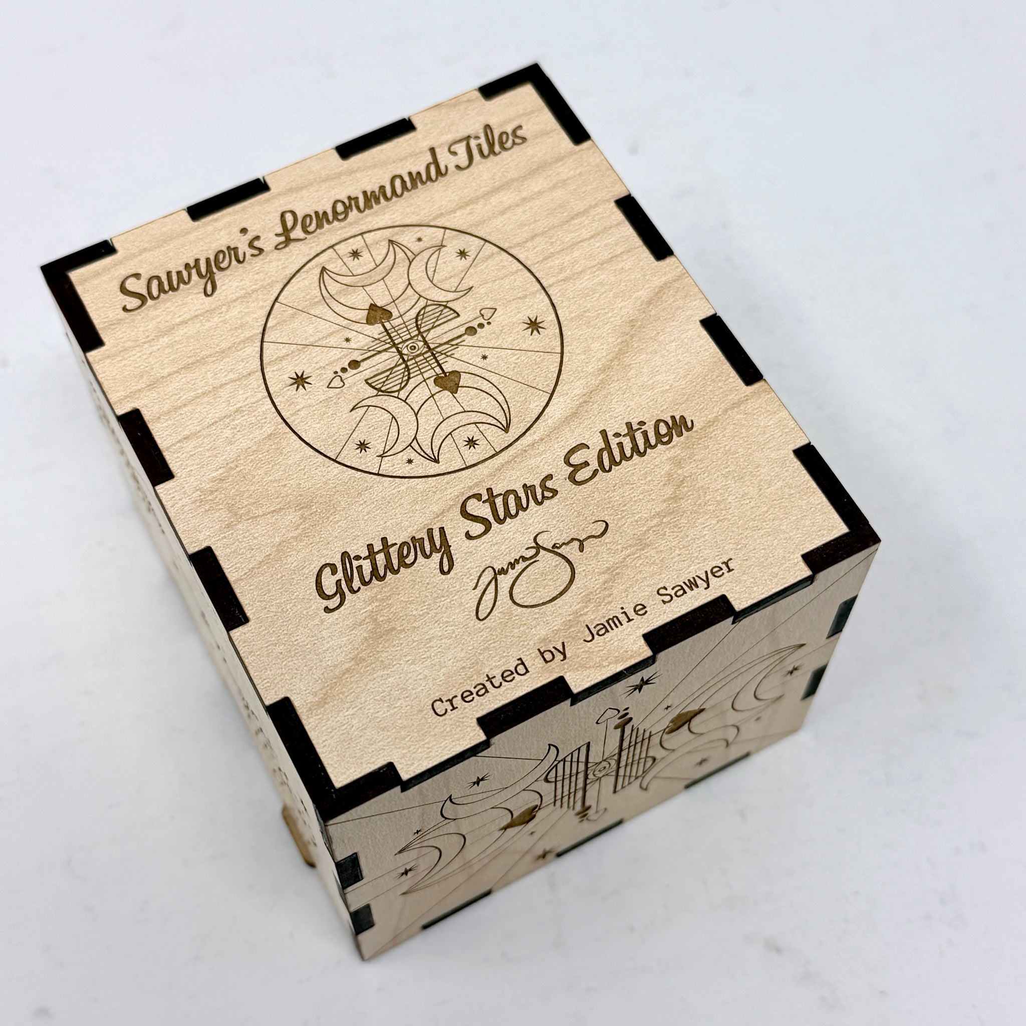 The same Lenormand tiles that we’ve come to be known for: hand crafted 38 piece mini Sawyer’s Lenormand wooden tile set complete with wooden engraved box. Now with a glittery stars finish!