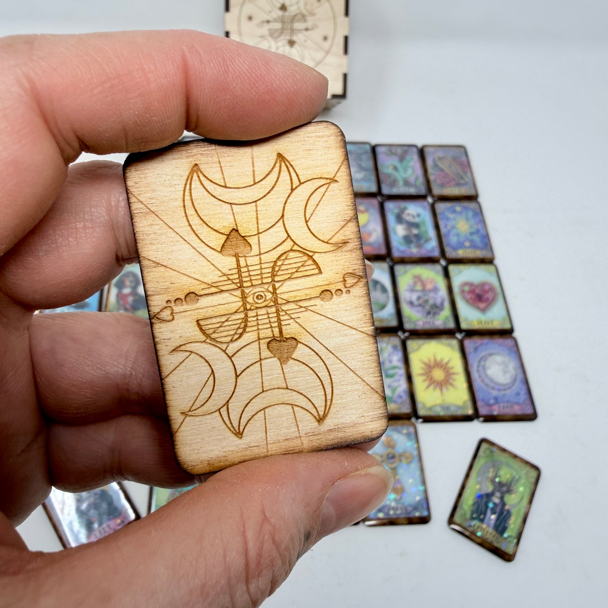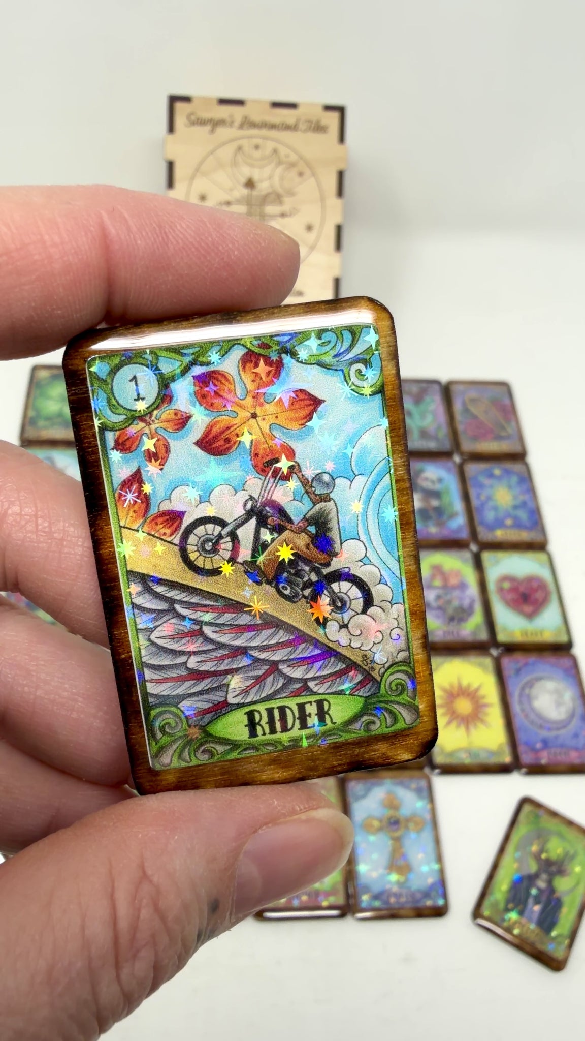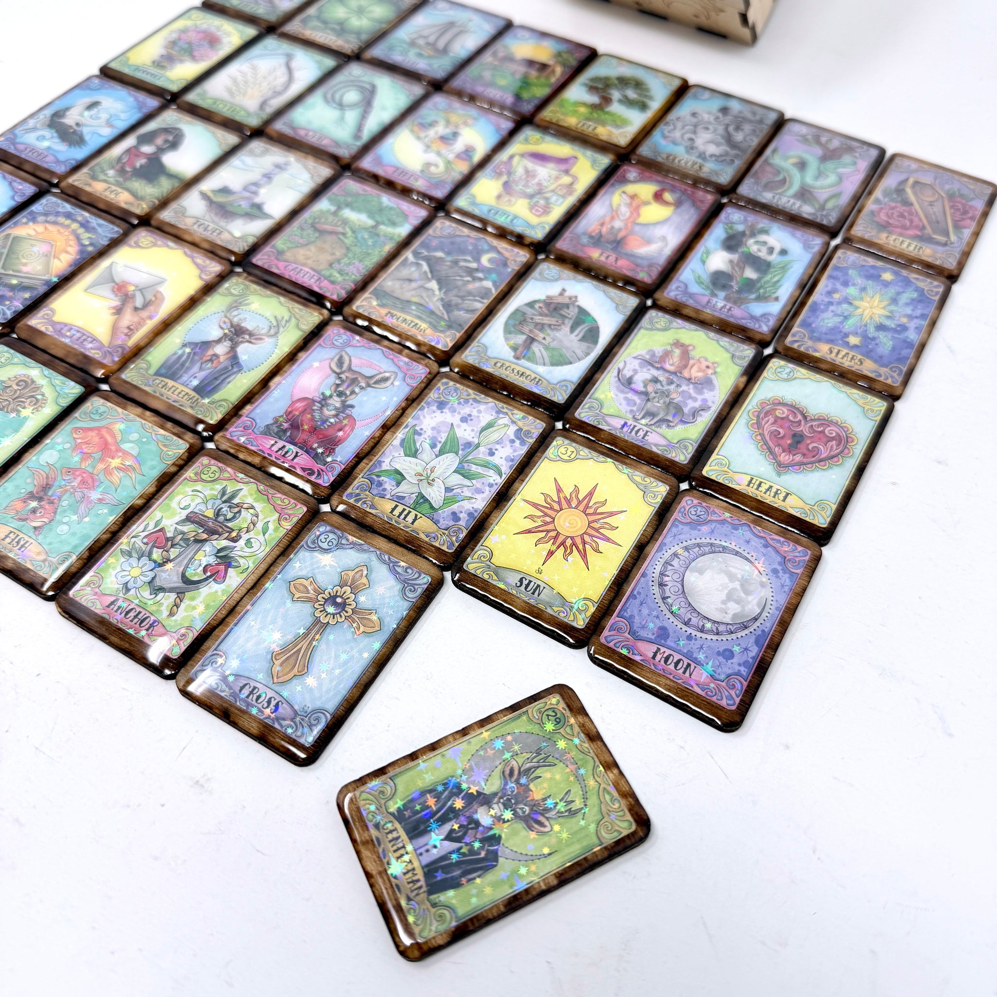 The same Lenormand tiles that we’ve come to be known for: hand crafted 38 piece mini Sawyer’s Lenormand wooden tile set complete with wooden engraved box. Now with a glittery stars finish!