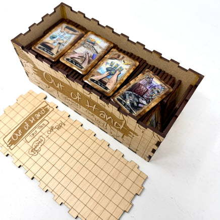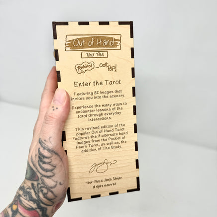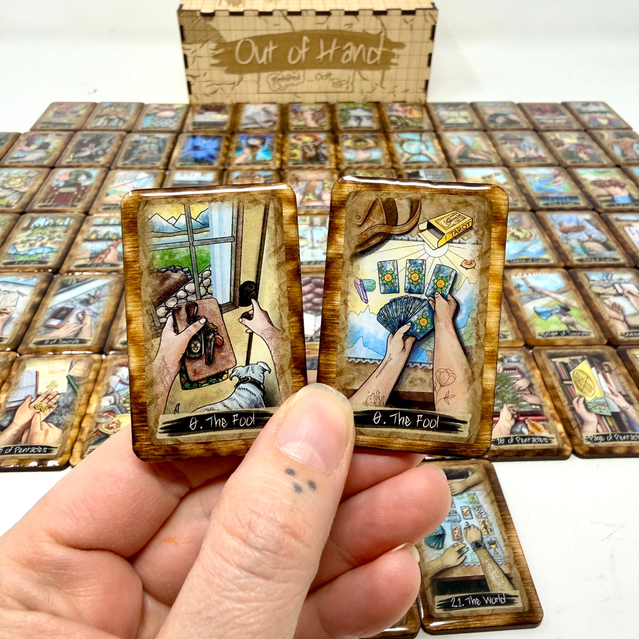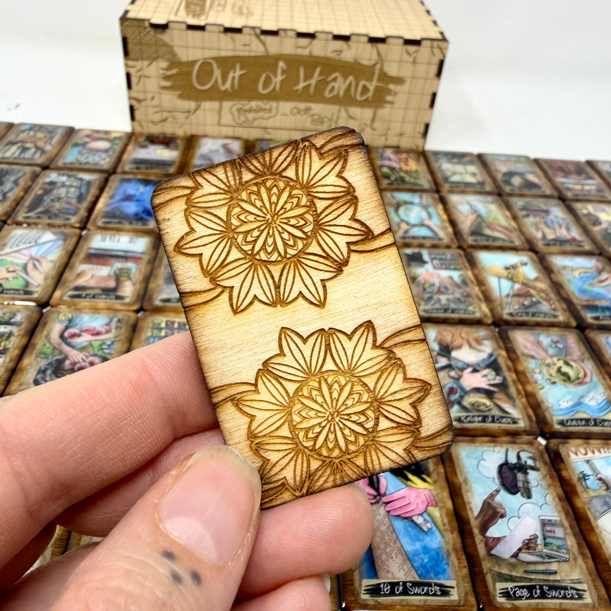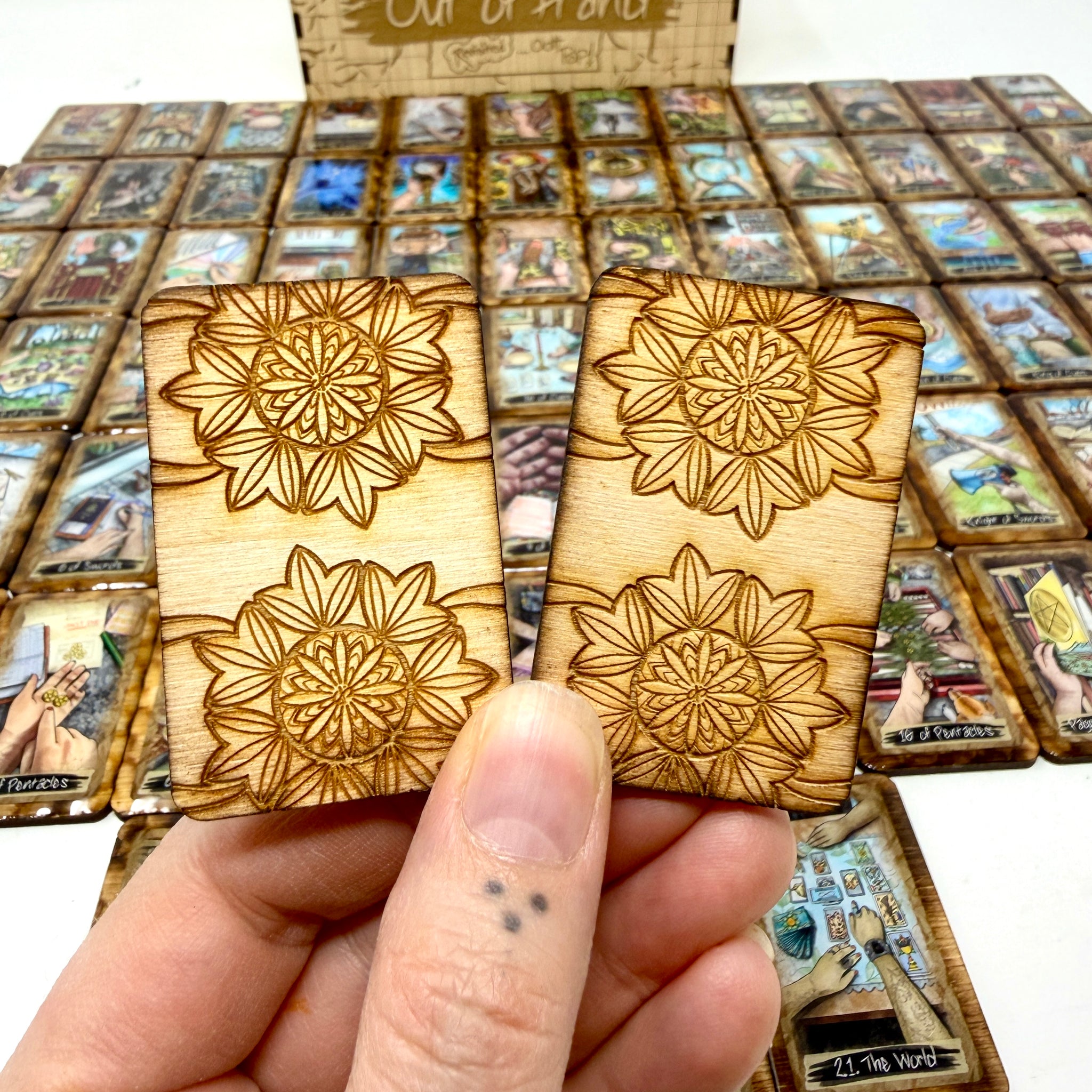 A hand crafted 82 piece mini Out of Hand Tarot wooden tile set complete with a wooden engraved box.