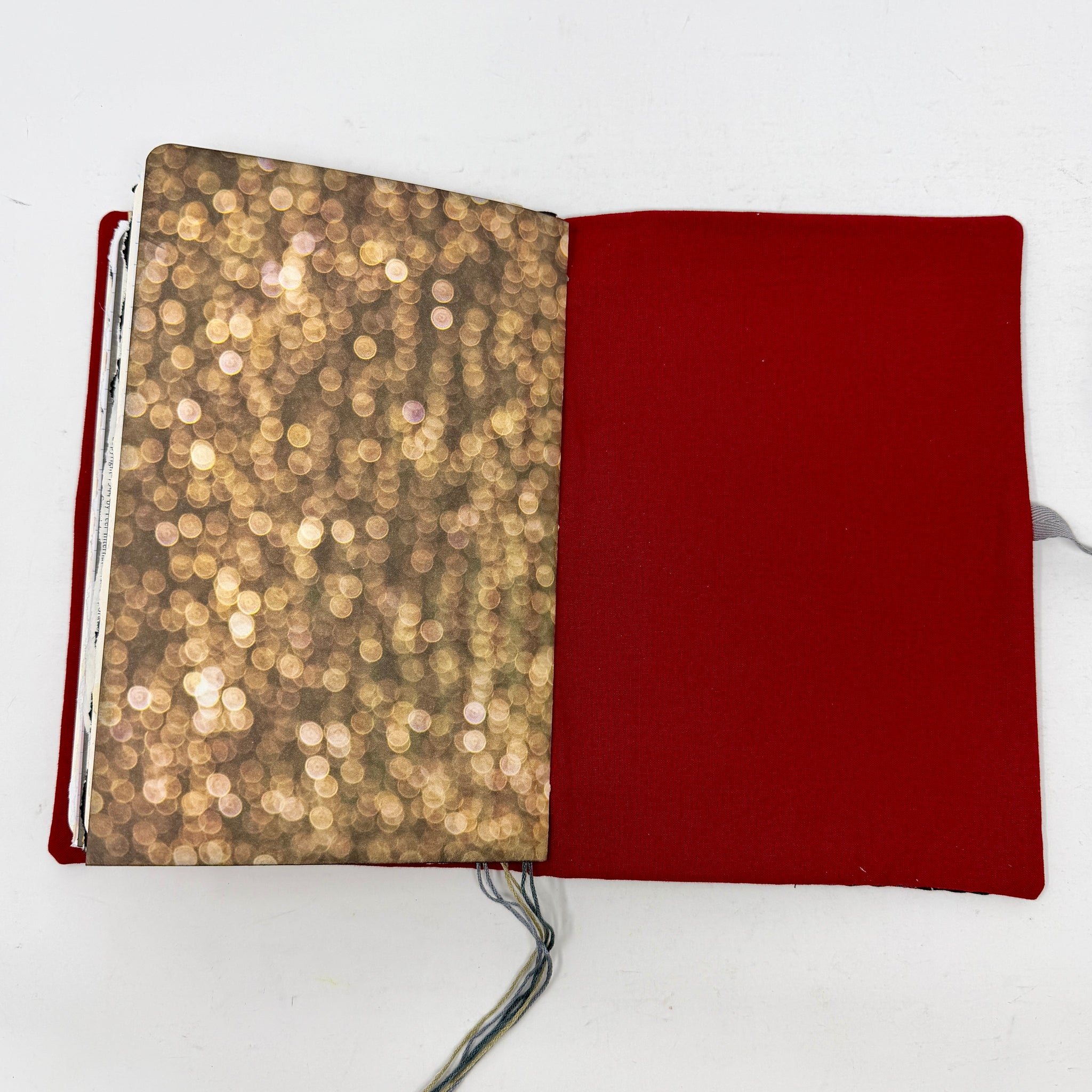 This Journal is 6 x 9 or “trade paperback” sized. There are 3 signatures (sections) inside each has a thick scrapbook paper pocket with 11 folded pages tucked in each meaning there are a toral of 132 surfaces to journal, glue or craft as you see fit. I personally love to mix any and all types of paper crafting with my journals so that they get super chunky!