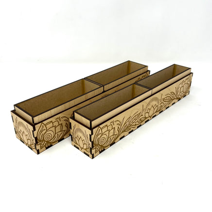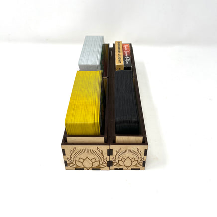 A slimline Deck Storage Tray that holds up to 2 decks. Offered in 2 sizes, Standard Tarot or Indie Sized. Featuring a lotus and filigree pattern around the outer sides.