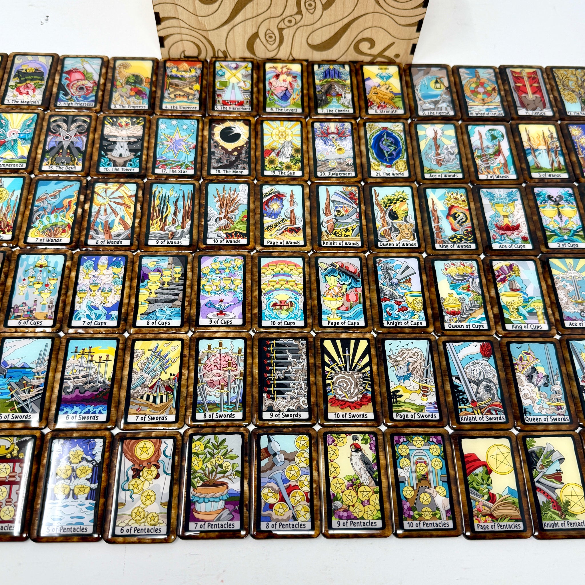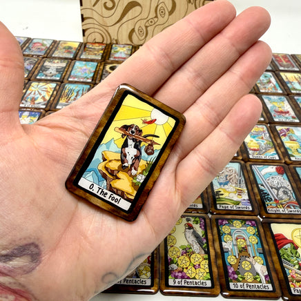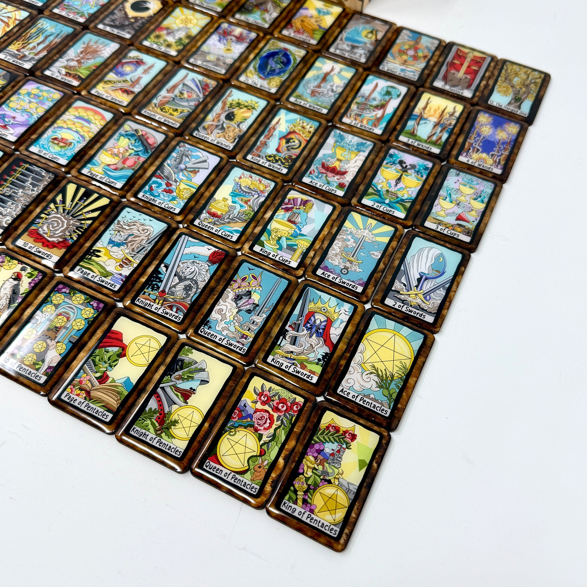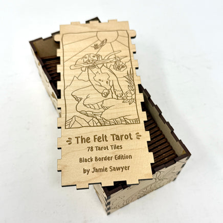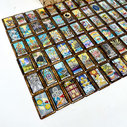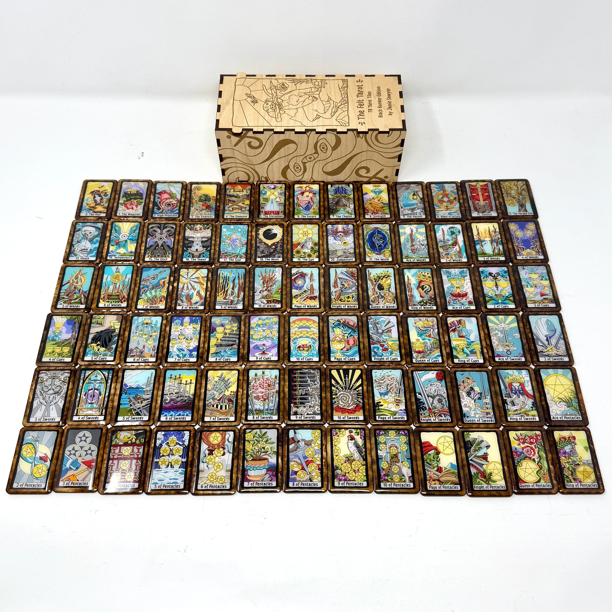 Work with The Felt Tarot in our heirloom tile variants! This set features our colorful Felt Tarot images set in a black border instead of the color coded suits.